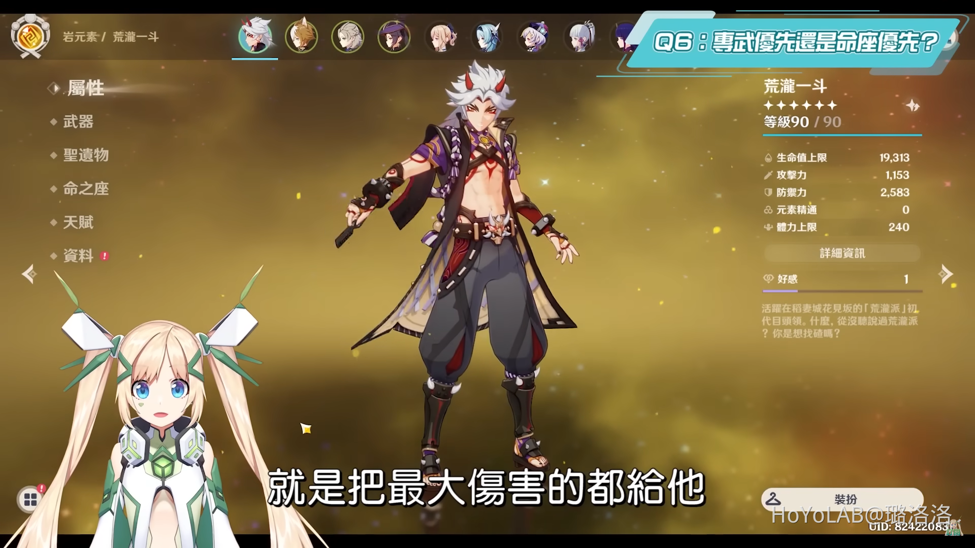 哈囉哈囉! 我是虛擬Youtuber璐洛洛,隨著這次《原神》2.7版本下半卡池上線後,岩隊當家主C荒瀧一斗也復刻回歸了,雖然一斗的人氣好像不比阿忍高,但其實也不能全算在因為一斗是男角的關係,而是因為岩元素本來就是一種比較獨立的屬性,隊伍組成上會傾向越純色越好,如果你是喜歡玩純色隊又簡單暴力的玩家,那麼岩隊會是非常安逸又爽快的隊伍,然而在充滿元素的提瓦特大陸中,元素反應又是重要的一環,因此假如你還沒有先練好其中一種元素隊伍的話,會建議在抽一斗前可以先看看本次的復刻Q&A,先思考一下自己是否需要再抽,一斗到2.7版本後的武器、聖遺物推薦和組隊搭配基本上都沒有什麼改變,所以如果這次有抽一斗的新人可以再回去看先前的一斗角色全分析影片,而如果是為了阿忍+1但是一斗不小心也+1的話,影片中也會再稍微補充先前沒有提到的重點,那影片開始前,若你還沒有訂閱洛洛的頻道的話,記得先訂閱一下唷!