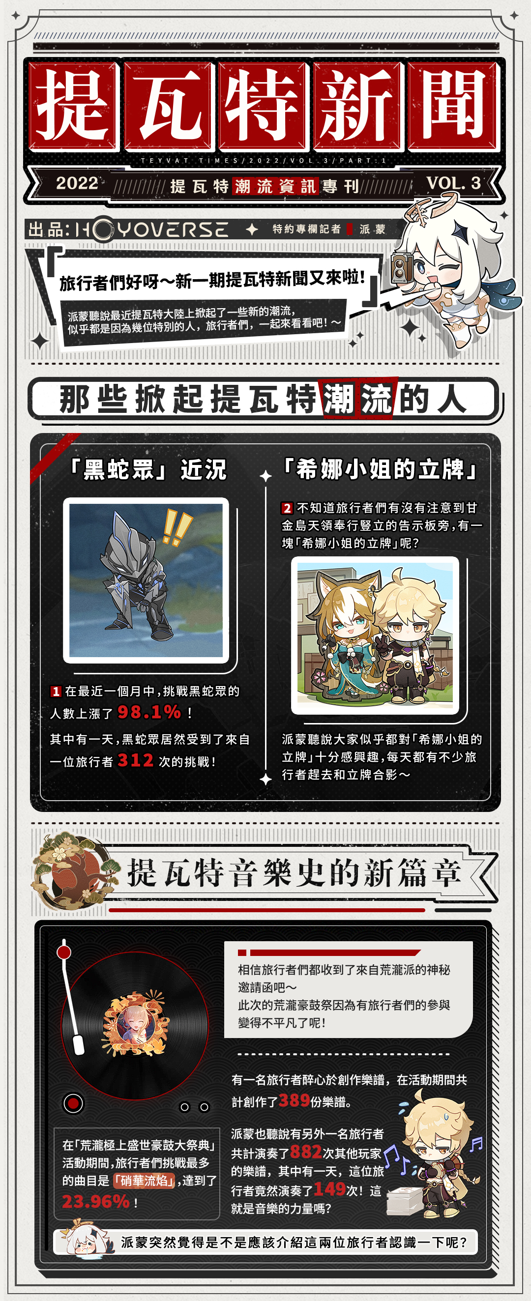 派蒙聽說最近提瓦特大陸上掀起了一些新的潮流,似乎都是因為幾位特別的人,旅行者們,一起來看看吧!~