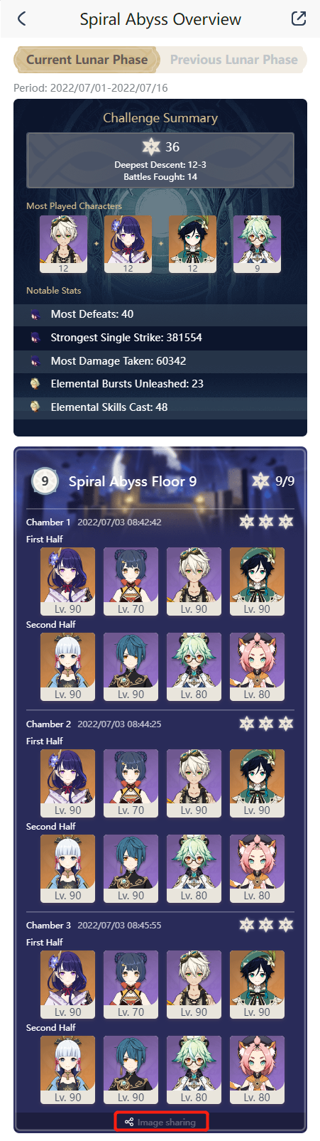 改善「深境螺旋」戰績展示,同時新增了分享功能。旅行者可以選擇分享深境螺旋整體挑戰回顧,也可以選擇僅分享單層挑戰紀錄及對應陣容。
