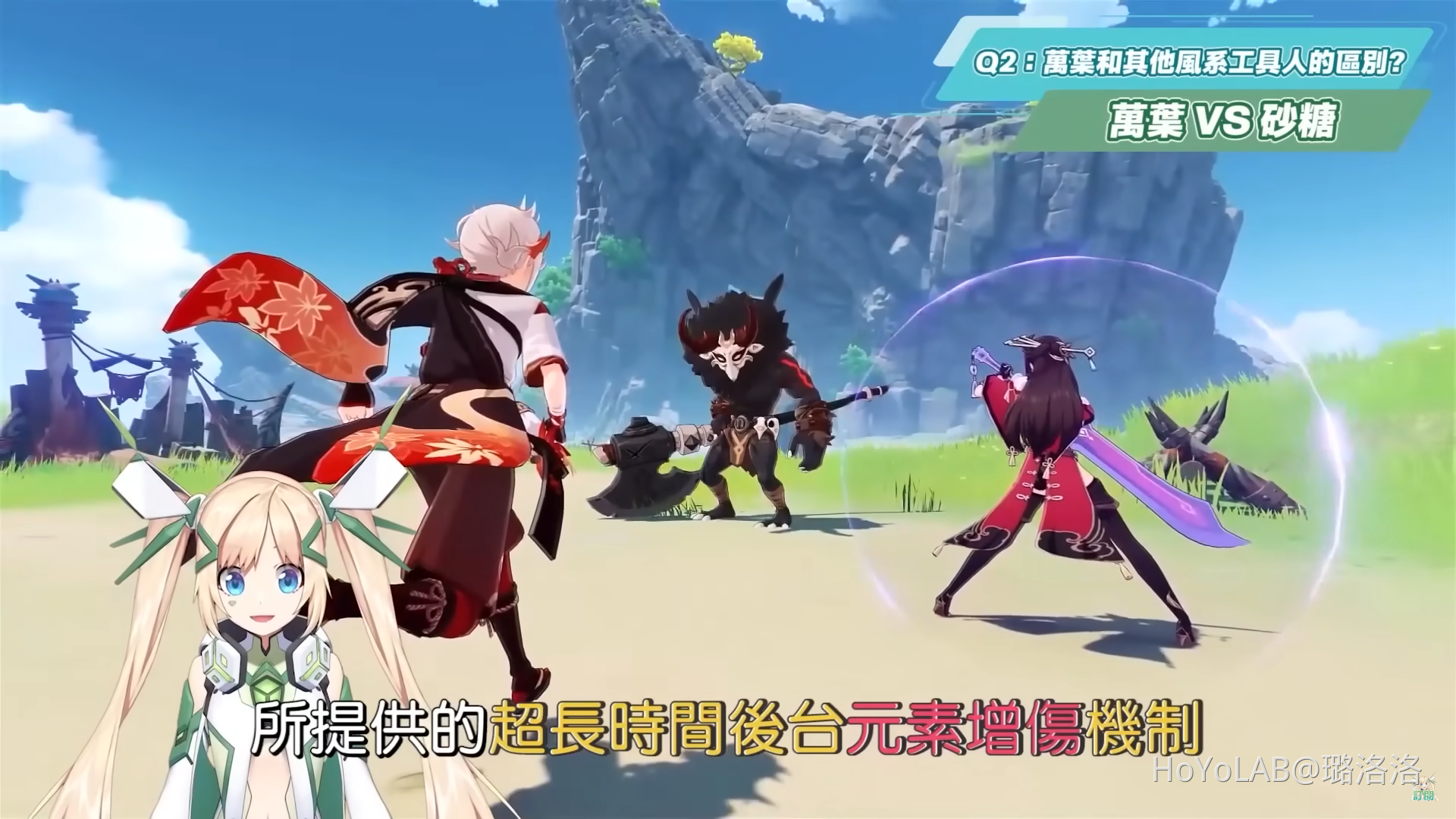 關於「魈可以配萬葉嗎」,其實洛洛沒有想到它會變成Q&A的其中一個問題,但是因為真的不論直播或是留言都有太多人問了,所以洛洛就將這個問題列入Q&A中一起回答,有看過萬葉的角色定位分析影片就會知道,萬葉提供的最主要作用就是「元素增傷」,這個元素增傷是要透過觸發「擴散反應」才能夠使對應的元素起到增傷的作用,因此要能夠成立這個先決條件,就是被增傷的該元素「要可以被擴散」,而在原神中可以被擴散的元素有水、火、冰、雷等四種元素,其他像是風、岩元素都是不能被擴散的,所以魈要從何來讓萬葉給它增傷?如果有朋友會問你這類的問題,就要分享給它這支影片,因為會問這個問題,代表最基礎的元素反應機制都還不是很熟,如果你是打算要抽萬葉來給魈增傷的話,請趕快矯正一下這個錯誤的想法,而如果你只是想用來取代原本魈隊伍中砂糖的這個位子的話,砂糖主要提供給魈的作用是在於提供充能,因為砂糖可以多段E技能快速產生元素微粒給魈充能,加上提供雙風共鳴的效果,雖然說萬葉用祭禮劍或是1命也不是不能快速雙E,但是萬葉的大招並無法給風系主C帶來增傷,還不如放班尼特或夜蘭、又或是鍾離提供減抗來得更直接,萬葉跟魈組隊反而像是殺雞焉用牛刀這種大材小用的局面,所以幾乎是沒有隊伍推薦是用魈搭配萬葉的,也會體現出對基礎元素反應的不熟悉。