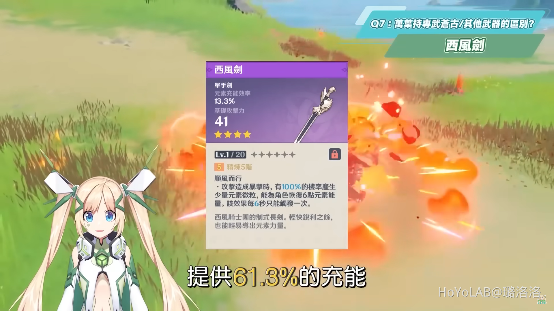 西風劍和祭禮劍一樣滿級時提供61.3%的充能,都是能夠緩解萬葉需要充能情況的武器選擇,兩者主要的差異在於一個適合對群,一個適合對單,通常在對群的時候因為怪物多,元素微粒也產得多,所以不太缺充能,但如果是對單像是只有魔偶劍鬼一名敵人的時候,西風劍提供的元素微粒效率就會比起祭禮劍還有鐵蜂刺要好,加上萬葉的五段式普攻總共可以打出8次傷害,也能快速觸發西風劍的被動效果產生元素微粒,使用這把武器要能更好的觸發被動的話,也會建議要精煉等級越高越好。