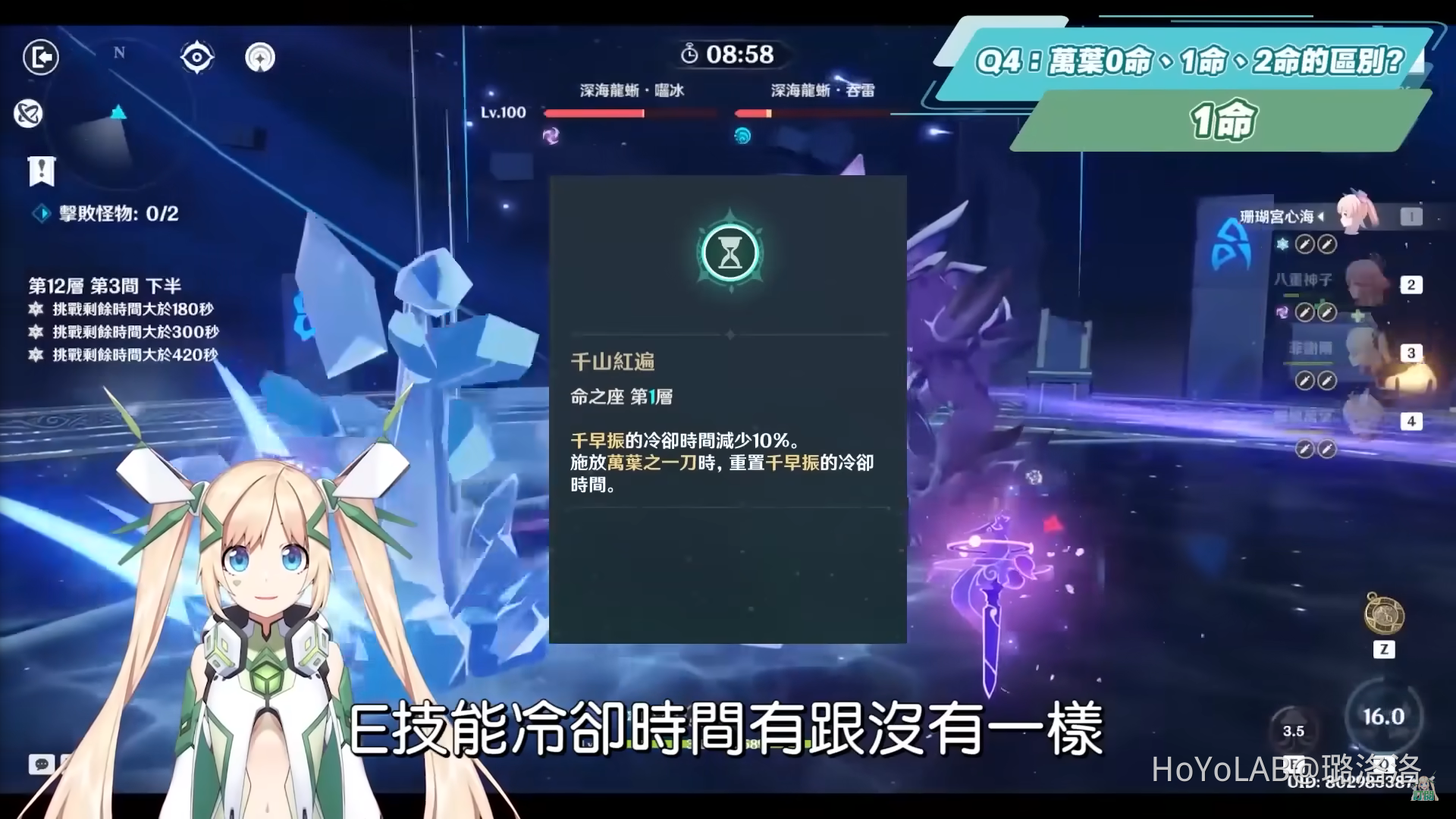 0命的萬葉雖然和砂糖作用看起來沒有差很多,即便萬葉要到2命才能提供場上全隊元素精通,完全擺脫與砂糖模糊不清的定位外,但萬葉更強的是他被動天賦「風物之詩詠」所提供的超長時間後台元素增傷機制,大招持續時長共有8秒,和砂糖主要提供元素精通的效果不同。