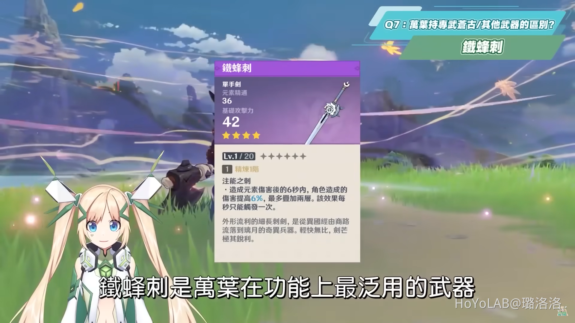 鐵蜂刺是萬葉在功能上最泛用的武器,而且也不需要精煉上去,只需要花你一個單手劍原胚,在大多數環境下從副屬性所提供的元素精通可以帶來些微的增傷,但也就這個效果而已,因為這把武器的被動效果跟萬葉的擴散沒有關係,用鐵鋒刺的另外一個好處是比較不會和其他角色搶武器。