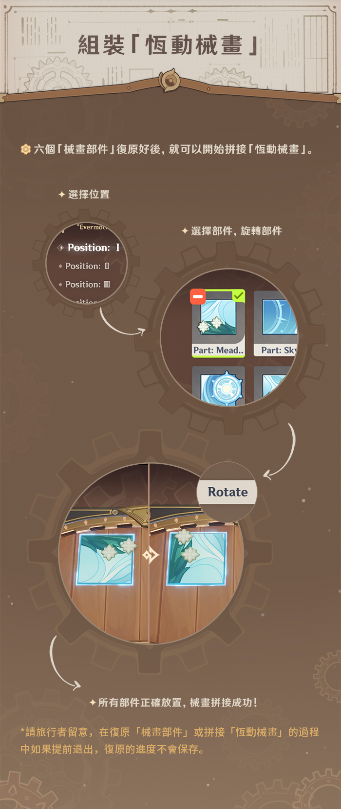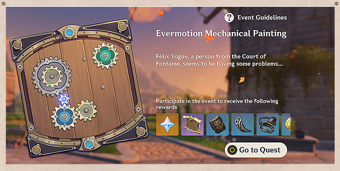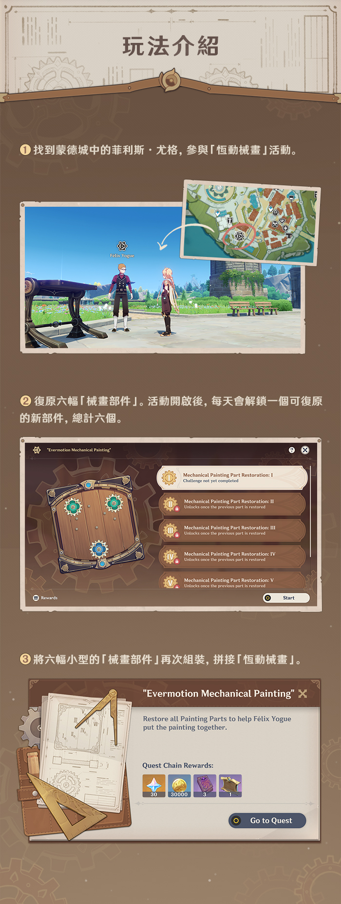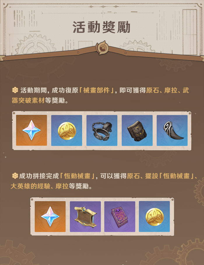 「恆動械畫」即將開啟。活動期間,幫助來自楓丹廷的菲利斯·尤格解決煩惱,復原「械畫部件」並拼接「恆動械畫」,完成後即可獲得原石、擺設、大英雄的經驗、武器突破素材、摩拉等獎勵。