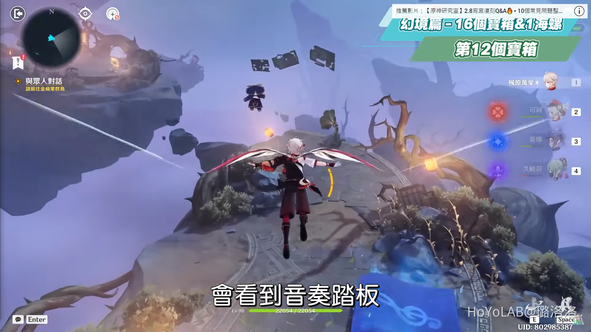 拿完被藤蔓包覆的寶箱後可以直接往下跳到火花的位置,從樹琴的方向往盡頭的門出去。出去後透過樹琴的氣流來到下一個島,會看到音奏踏板,跟著畫面一樣把順序踩對後解鎖樹琴,從氣流來到下一個島,繼續踩音奏踏板,踩完後直接演奏樹琴就可以開第12個寶箱。