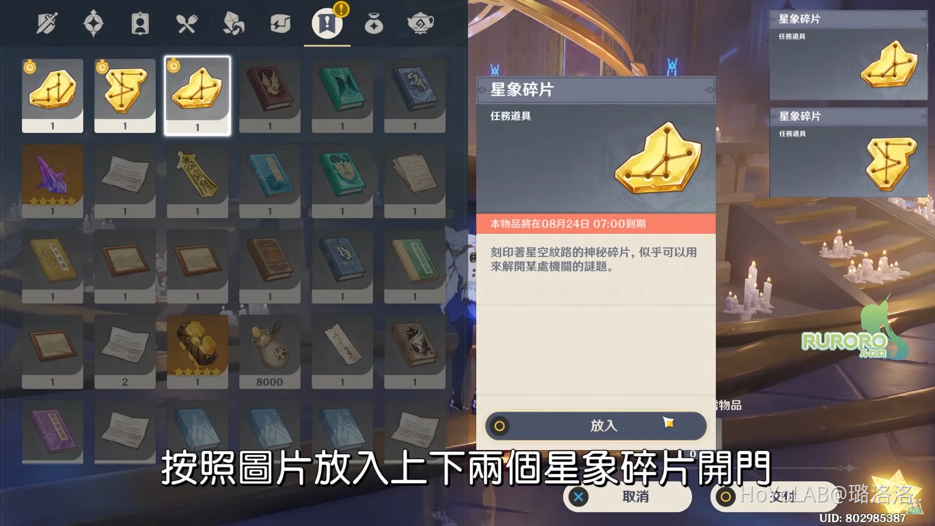 跟隨指引拿到新的碎片後進入第二階段的幻境,這次來開一進幻境後右手邊的門,可以參考圖片放入上下兩個指定碎片