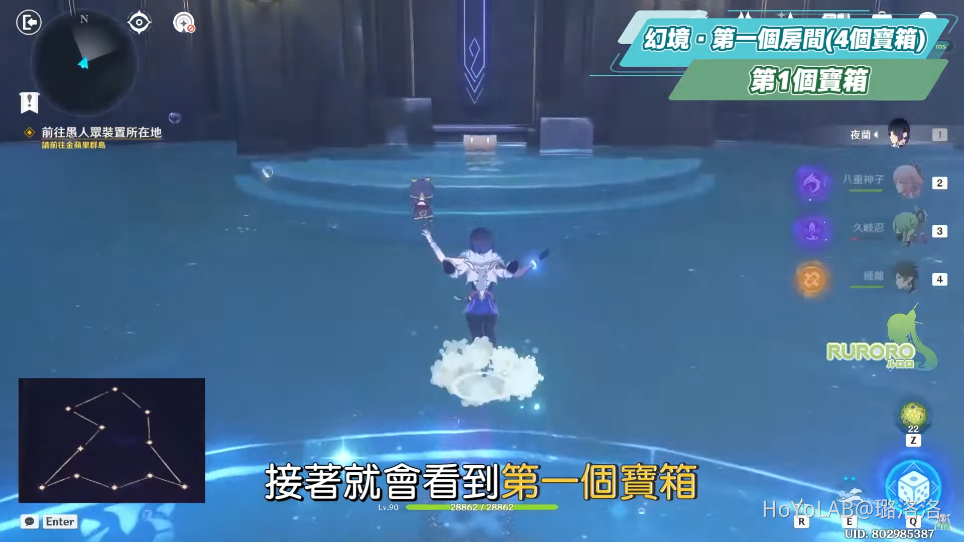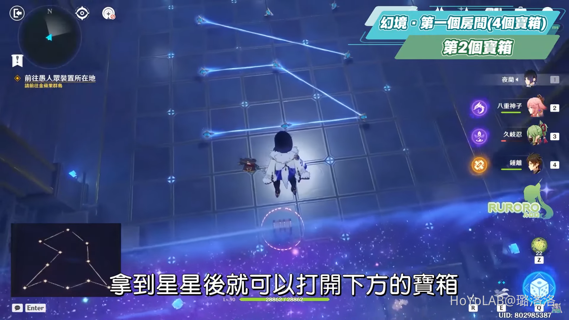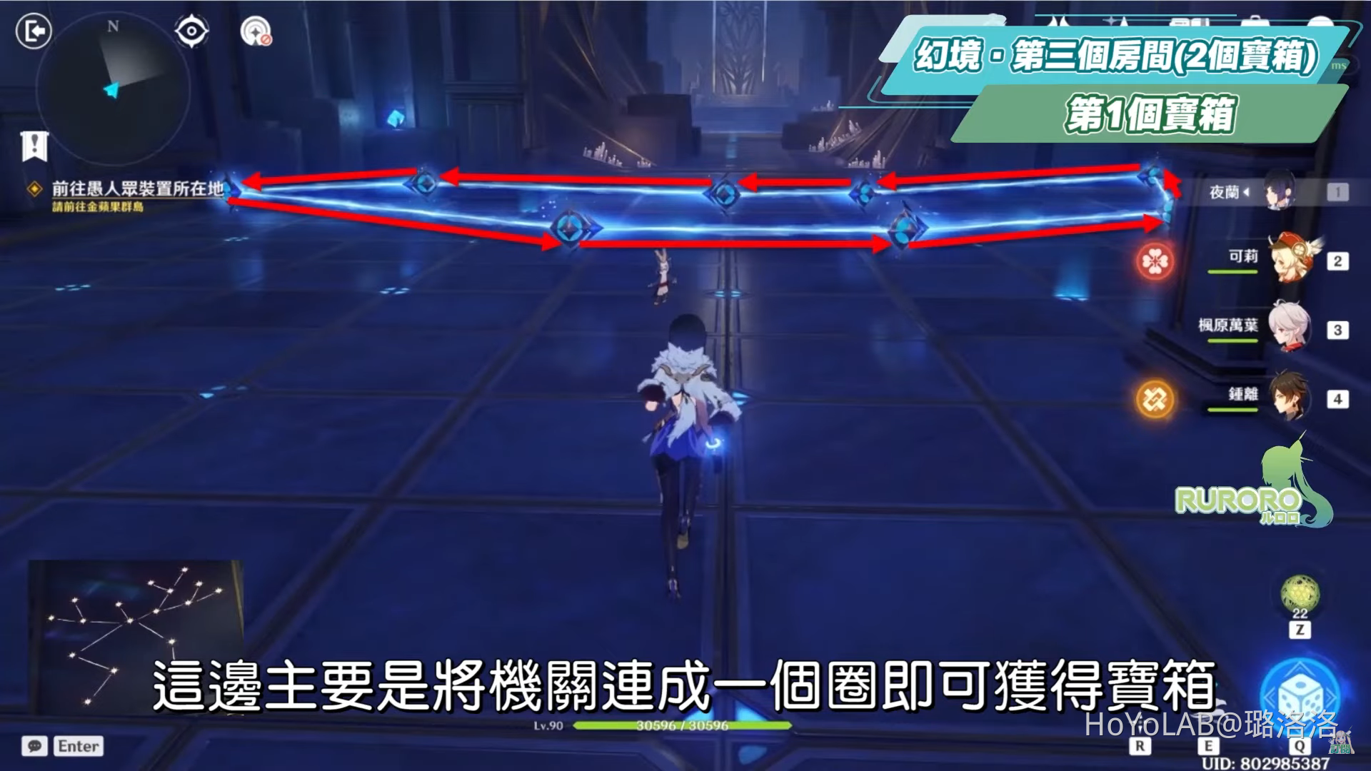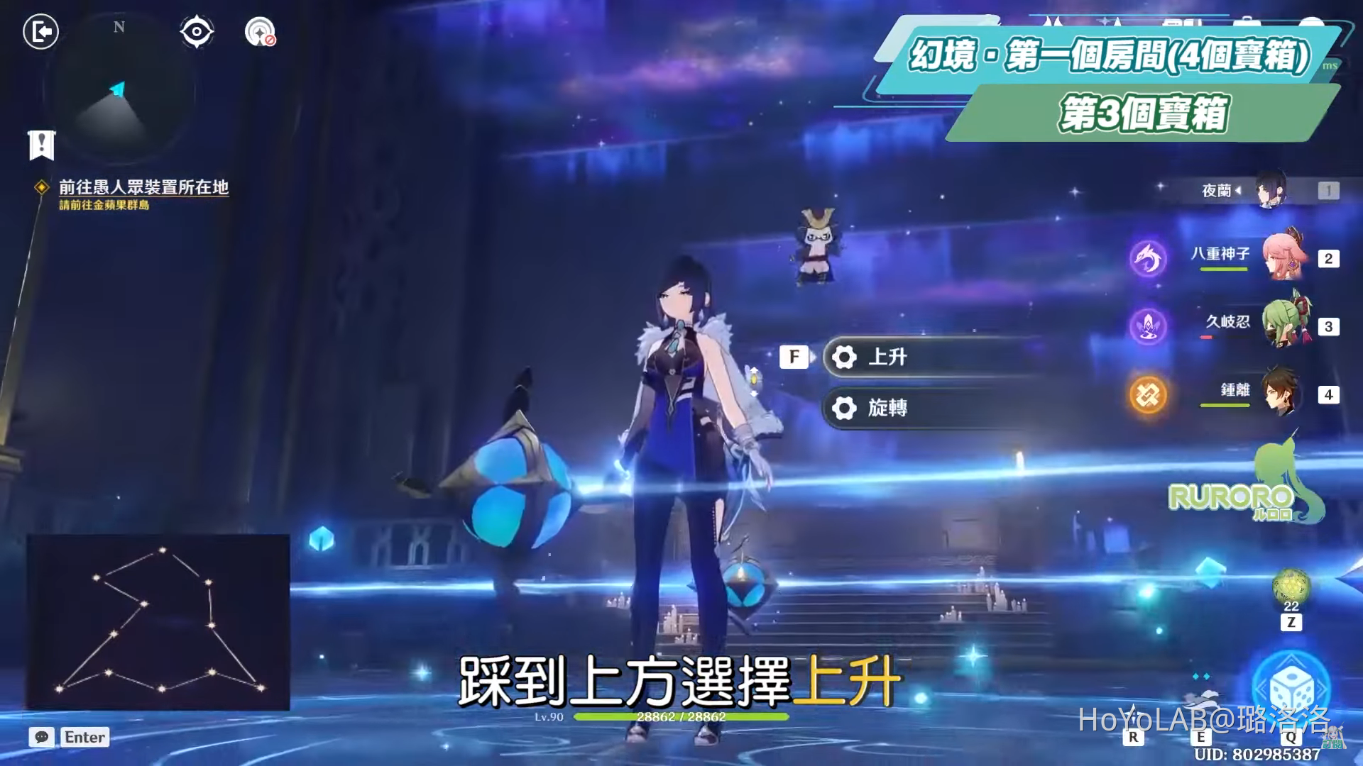 解完劇情後接下來再重新進入幻境來找寶箱,先來到和洛洛圖案一樣的門前,接著直奔往內到解謎的房間,會看到一個機關,切換它後地上會出現星盤,踩到星盤上選擇上升,接著就會看到第一個寶箱