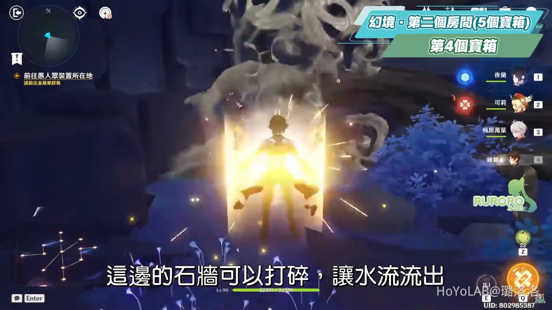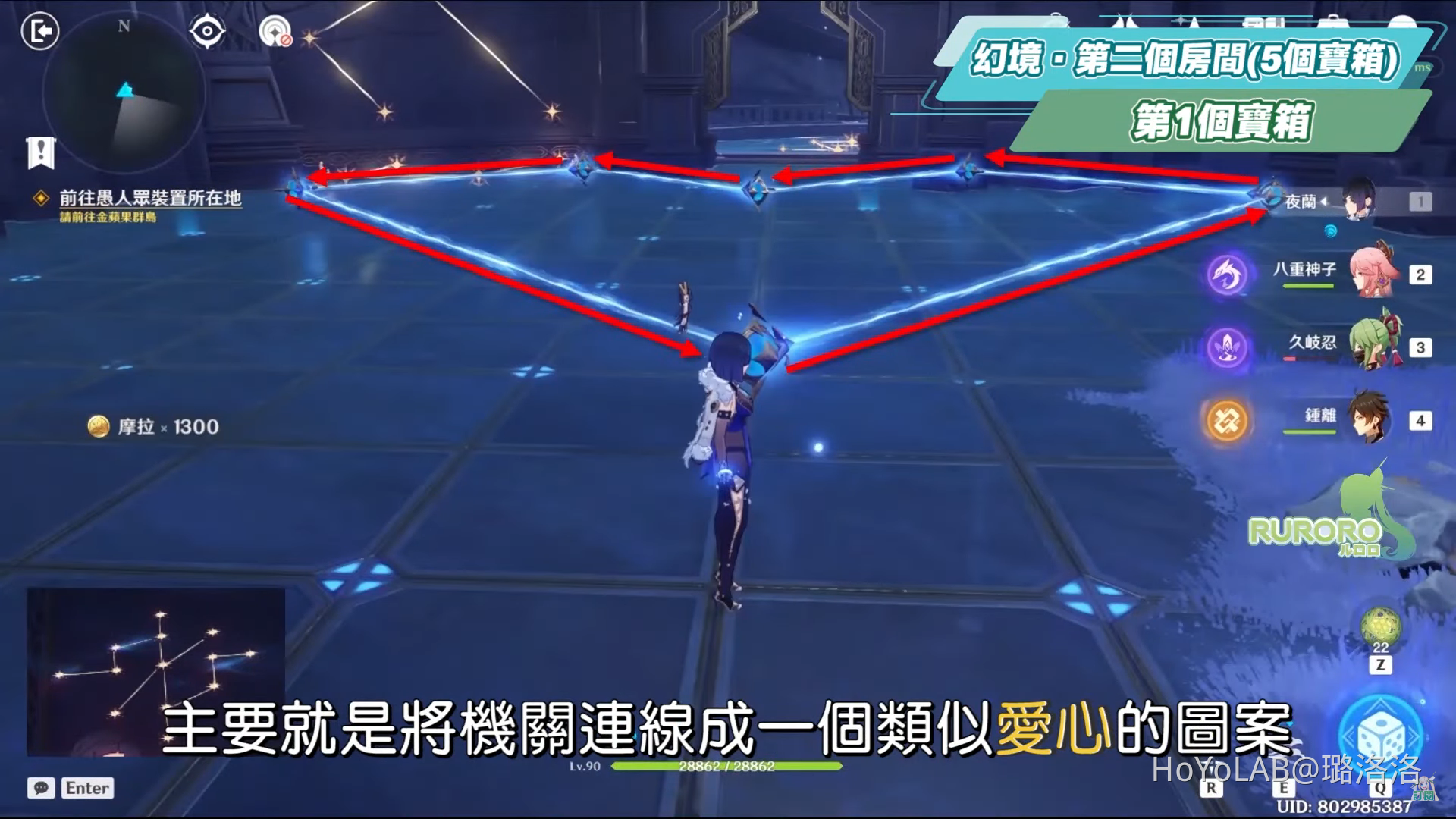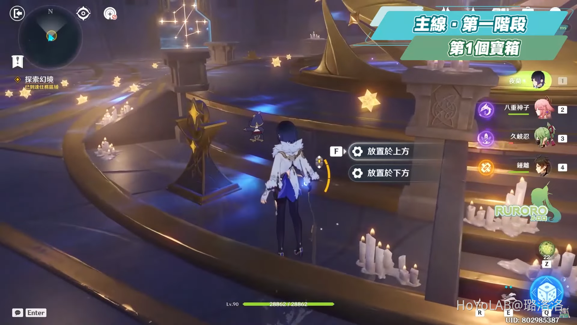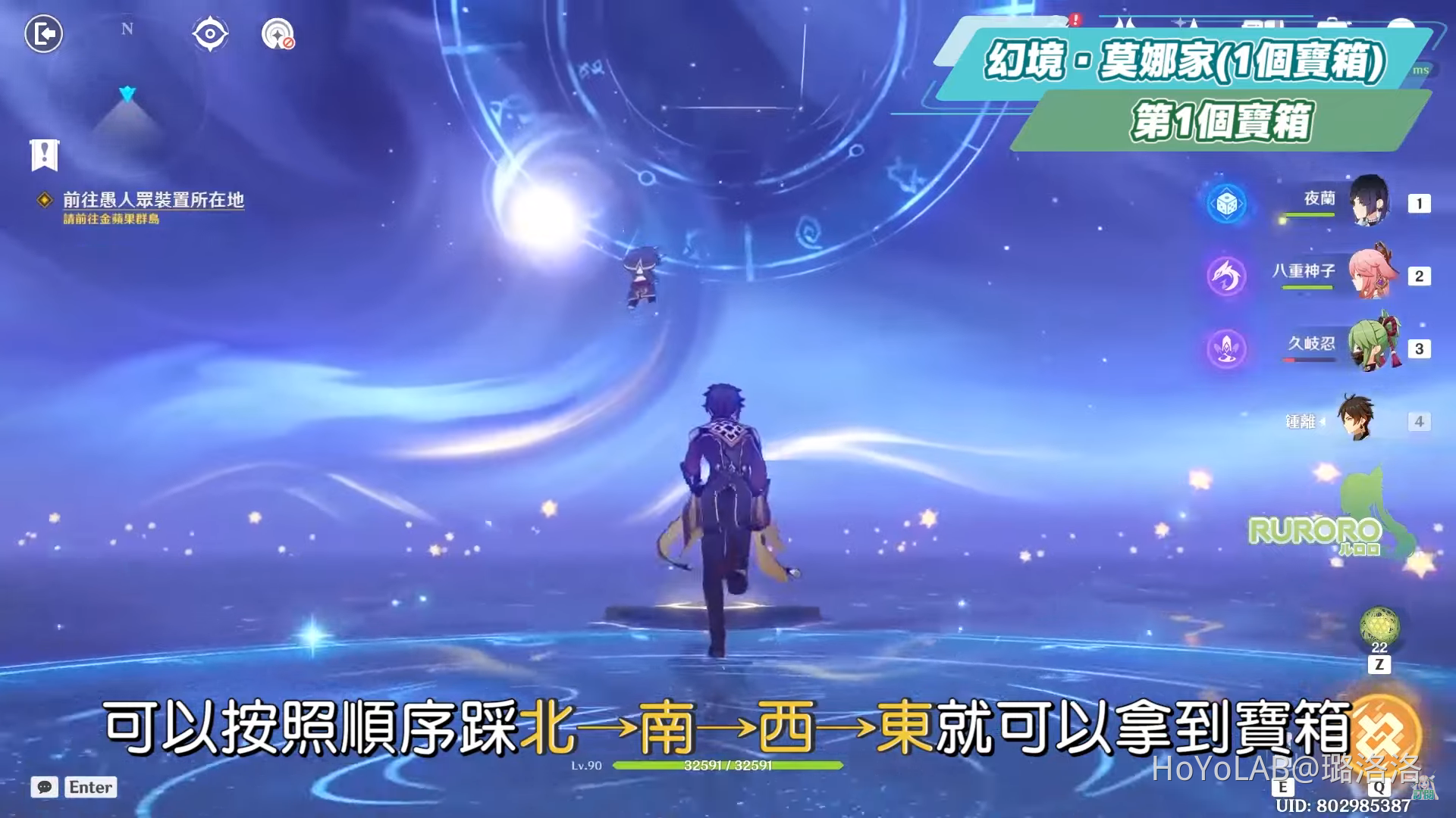 解完劇情後接下來再重新進入幻境來找寶箱,先來到和洛洛圖案一樣的門前,接著直奔往內到解謎的房間,會看到一個機關,切換它後地上會出現星盤,踩到星盤上選擇上升,接著就會看到第一個寶箱
