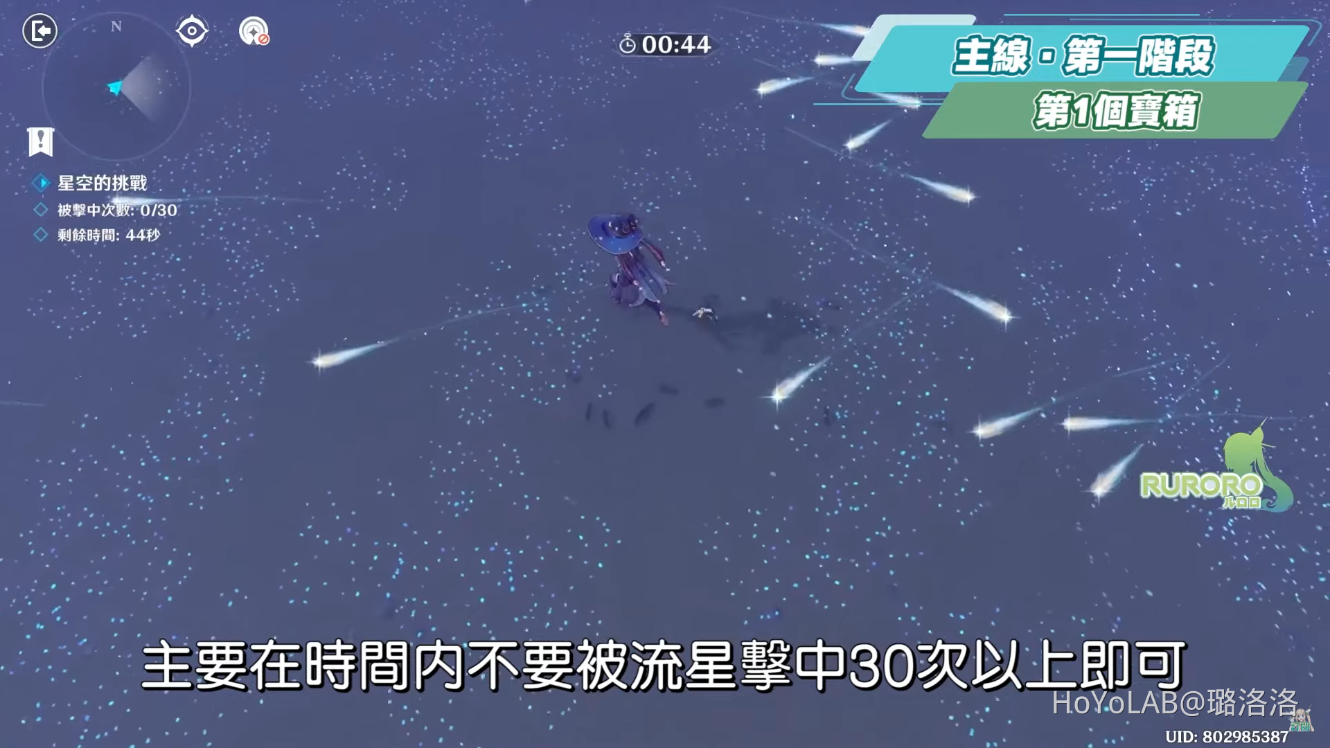 寶箱打開後會出現星星,跟隨星星返回大廳,並進入中央的水池,最後會來到星空的挑戰,主要在時間內不要被流星擊中30次以上即可,成功後後續看完劇情就完成劇情第一階段。