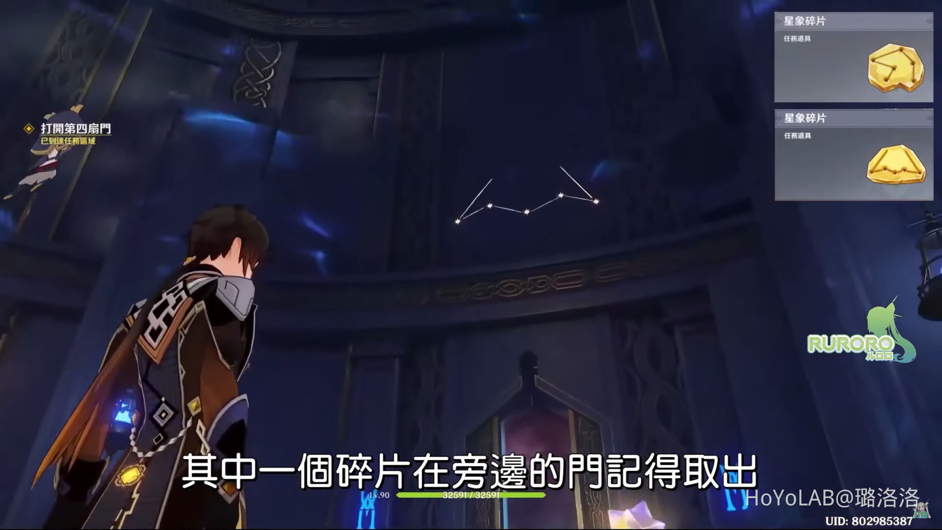 接著來到面向北方靠右的門操作機關,按照圖片放入上下兩個星象碎片開門。