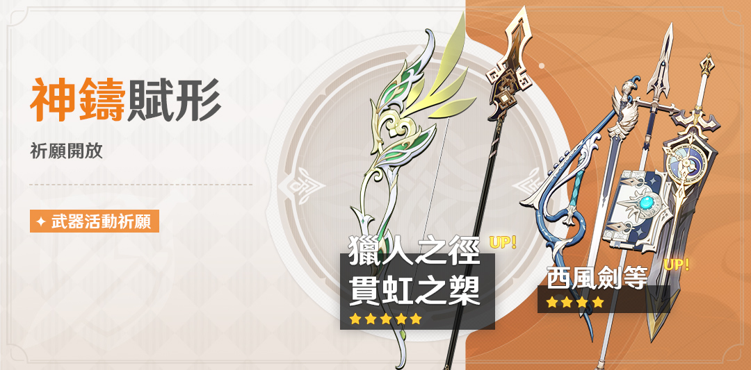 ●活動期間,限定五星武器「弓·獵人之徑」、「長柄武器·貫虹之槊」的祈願抽取機率將大幅提升!