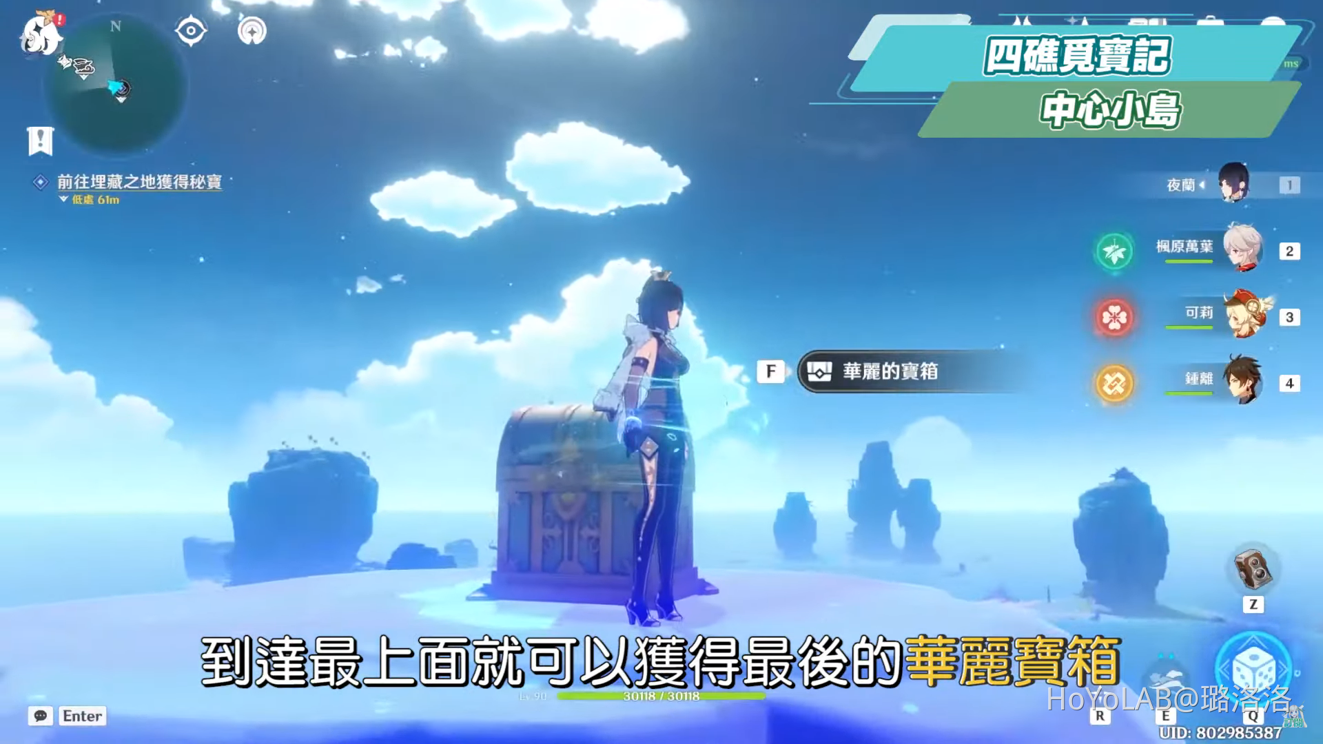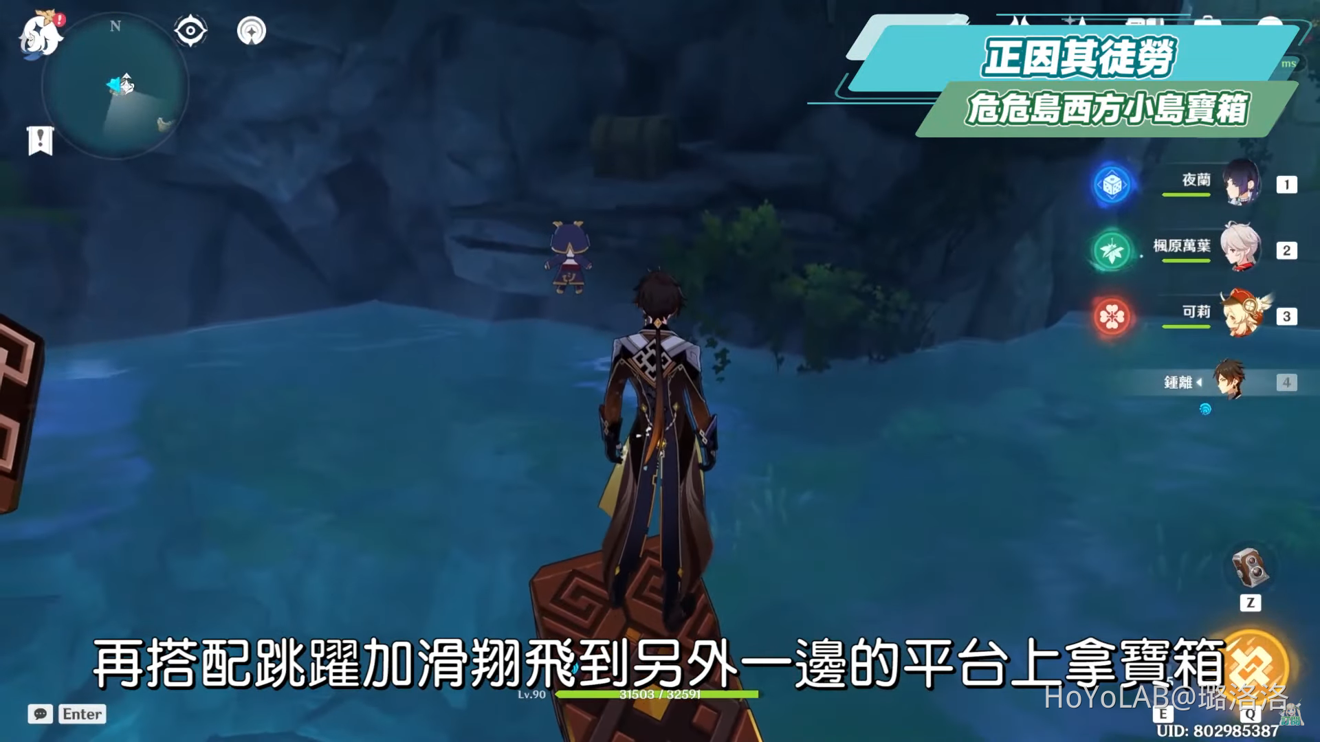 接著在岸邊用鍾離或岩主墊個高度,再搭配跳躍加滑翔飛到另外一邊的平台上拿寶箱。