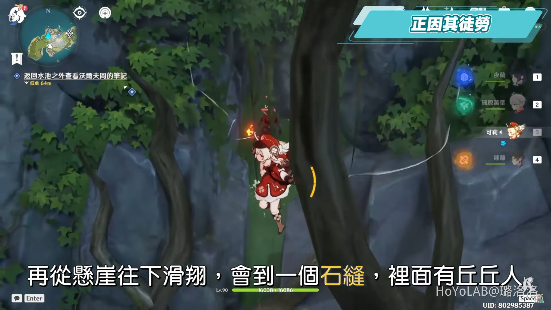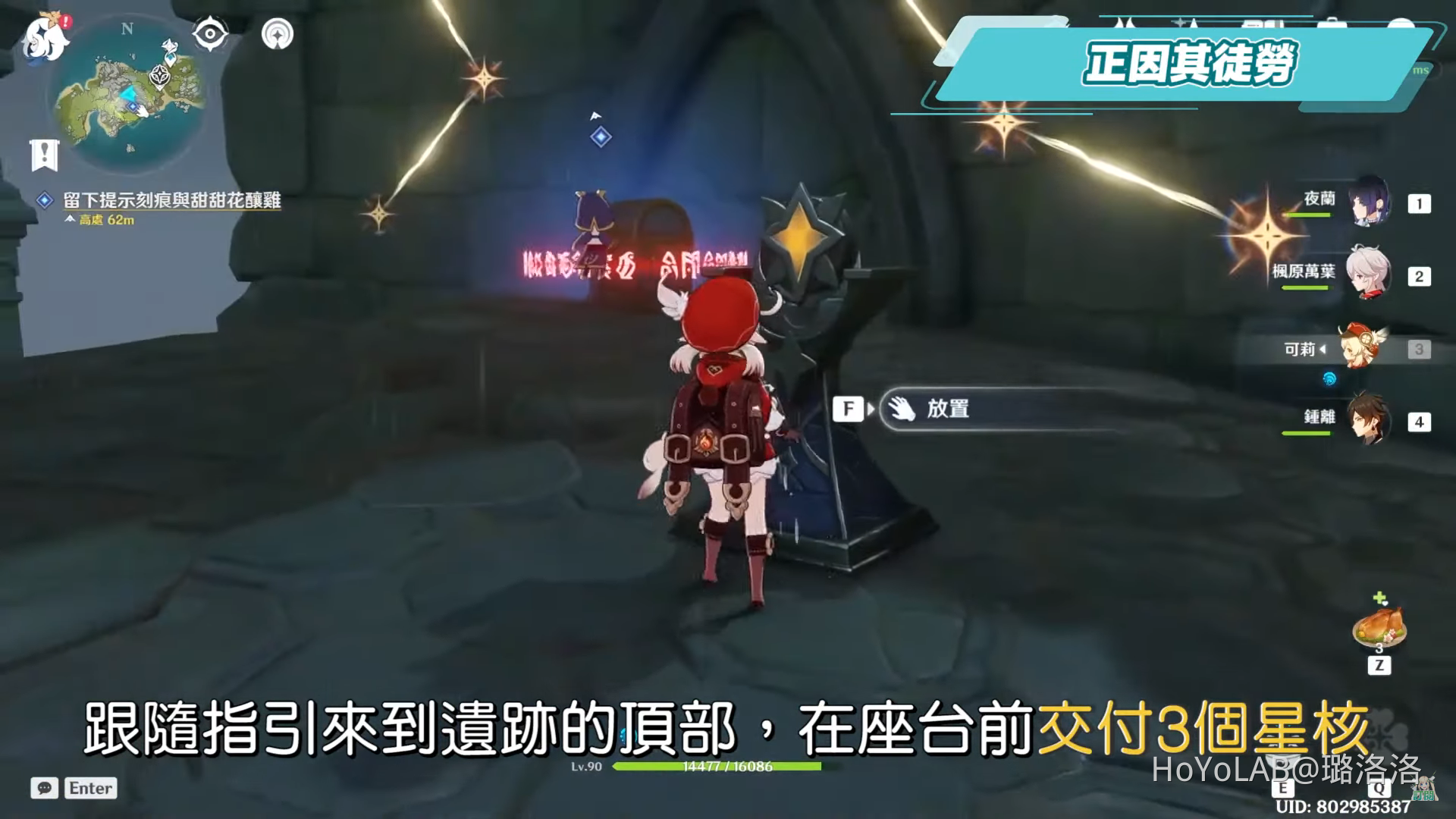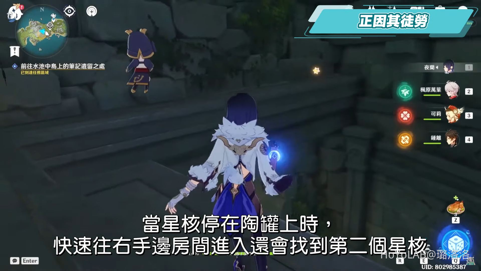 留下記號在牆上後,先不用跟著任務指引,從遺跡出來到外面後左轉往上坡一點,再從懸崖往下滑翔,會到一個石縫,裡面有丘丘人清理掉丘丘人後可以拾取一個星核