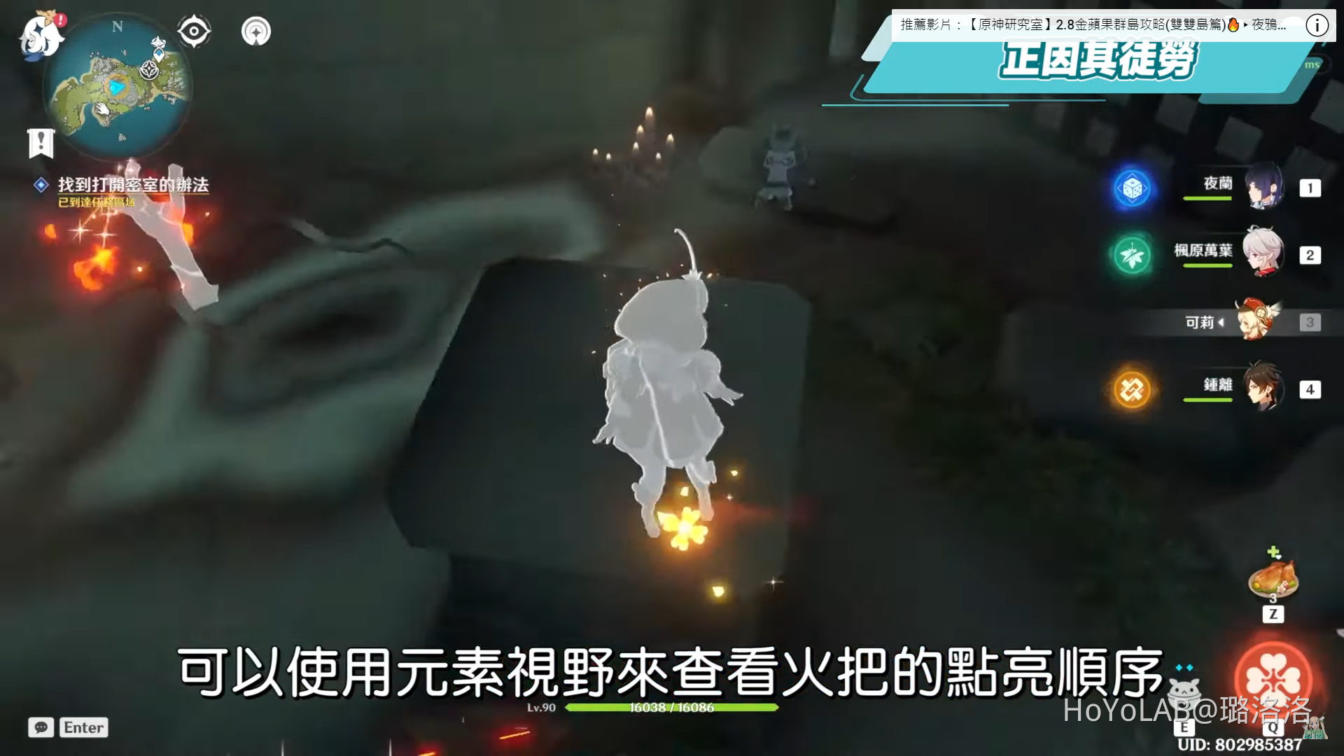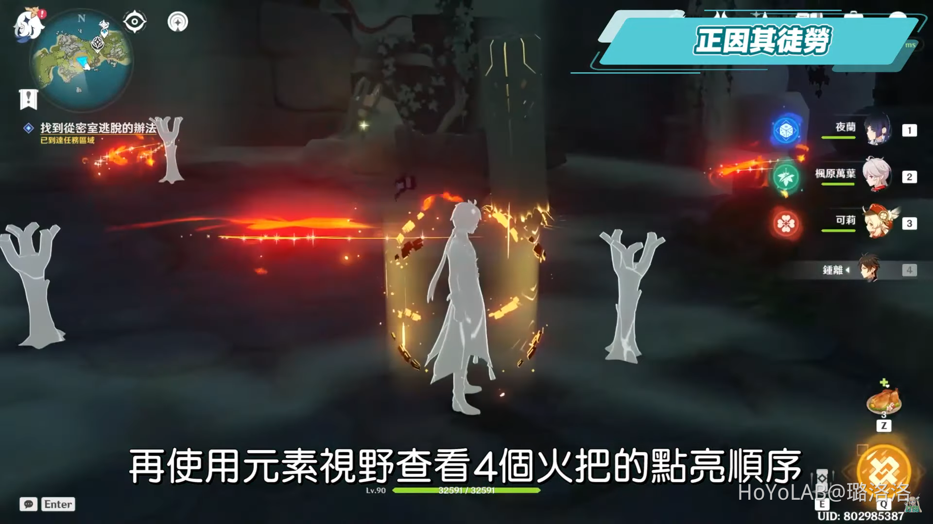 隨著任務指引來到遺跡的房間,被關在裡面後,可以使用元素視野來查看火把的點亮順序,再用火元素技能依序點亮