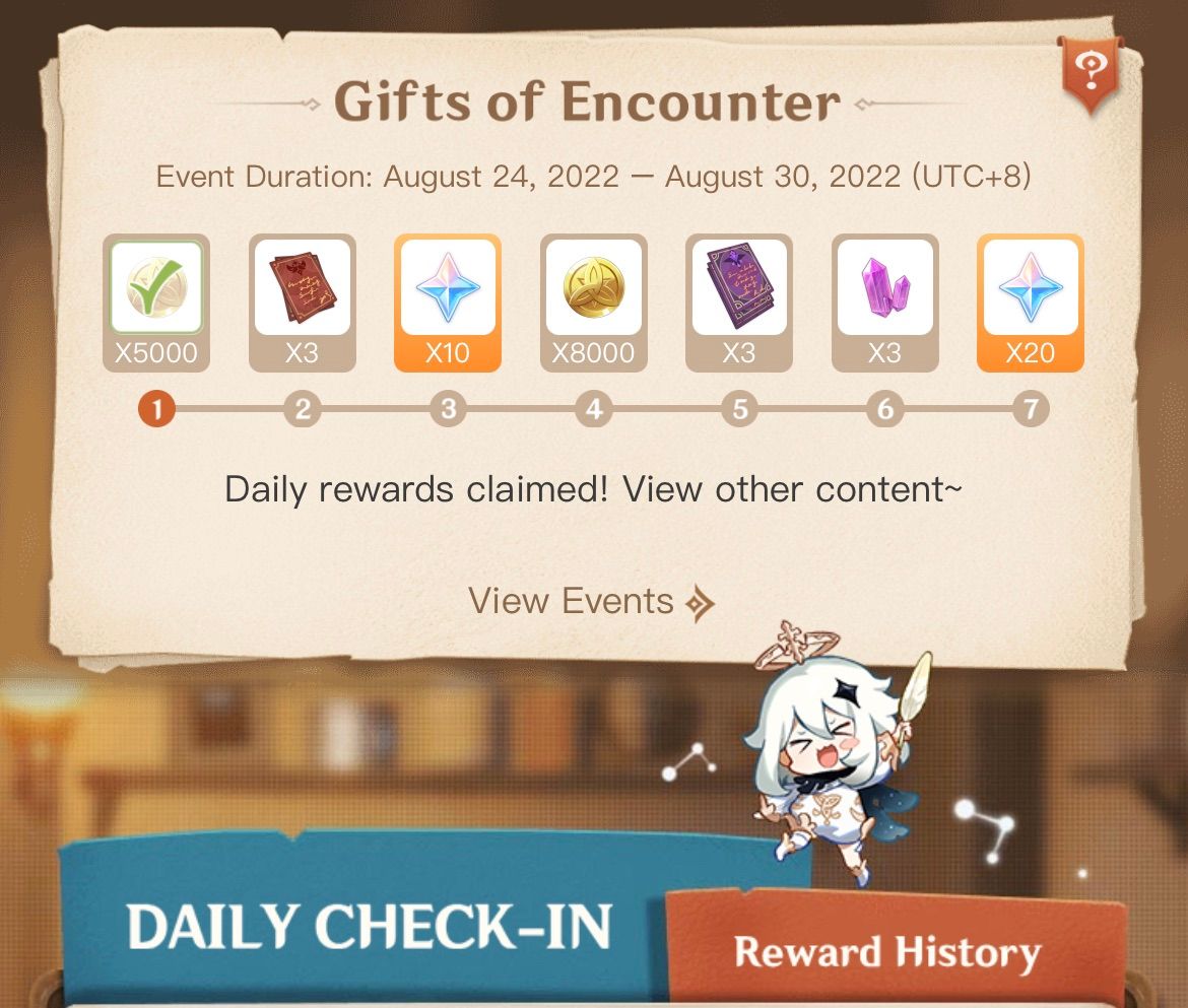 2022年8月24日-2022年8月30日(UTC+8),前往【簽到】進行每日簽到,可累計獲得原石x30、摩拉x13000等額外簽到獎勵!