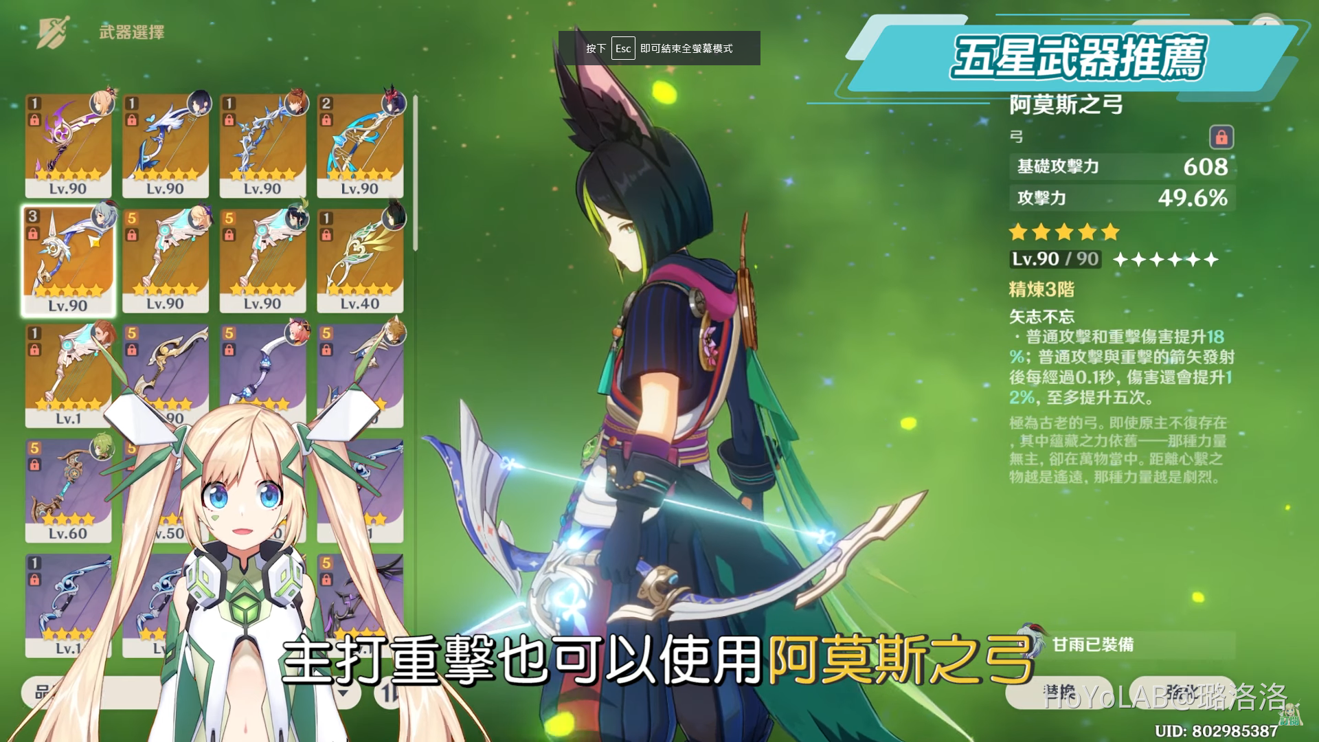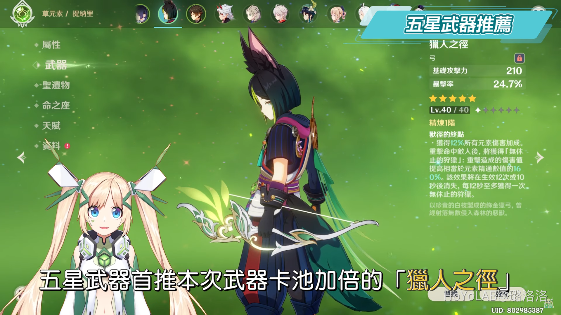 或是紀行武器可以獲得的蒼翠獵弓、彌補需要暴擊率的空間,以及元素爆發傷害增加的曚雲之月等等,而破魔之**然被動也有重擊傷害加成,但是大招要扣著不用,所以洛洛自己是不太推薦,但如果你的提納里主要作為速切的反應工具人定位使用的話,就更多選擇了,像是祭禮弓、西風獵弓,輔助向要求不高只要自己用得順手都可以。