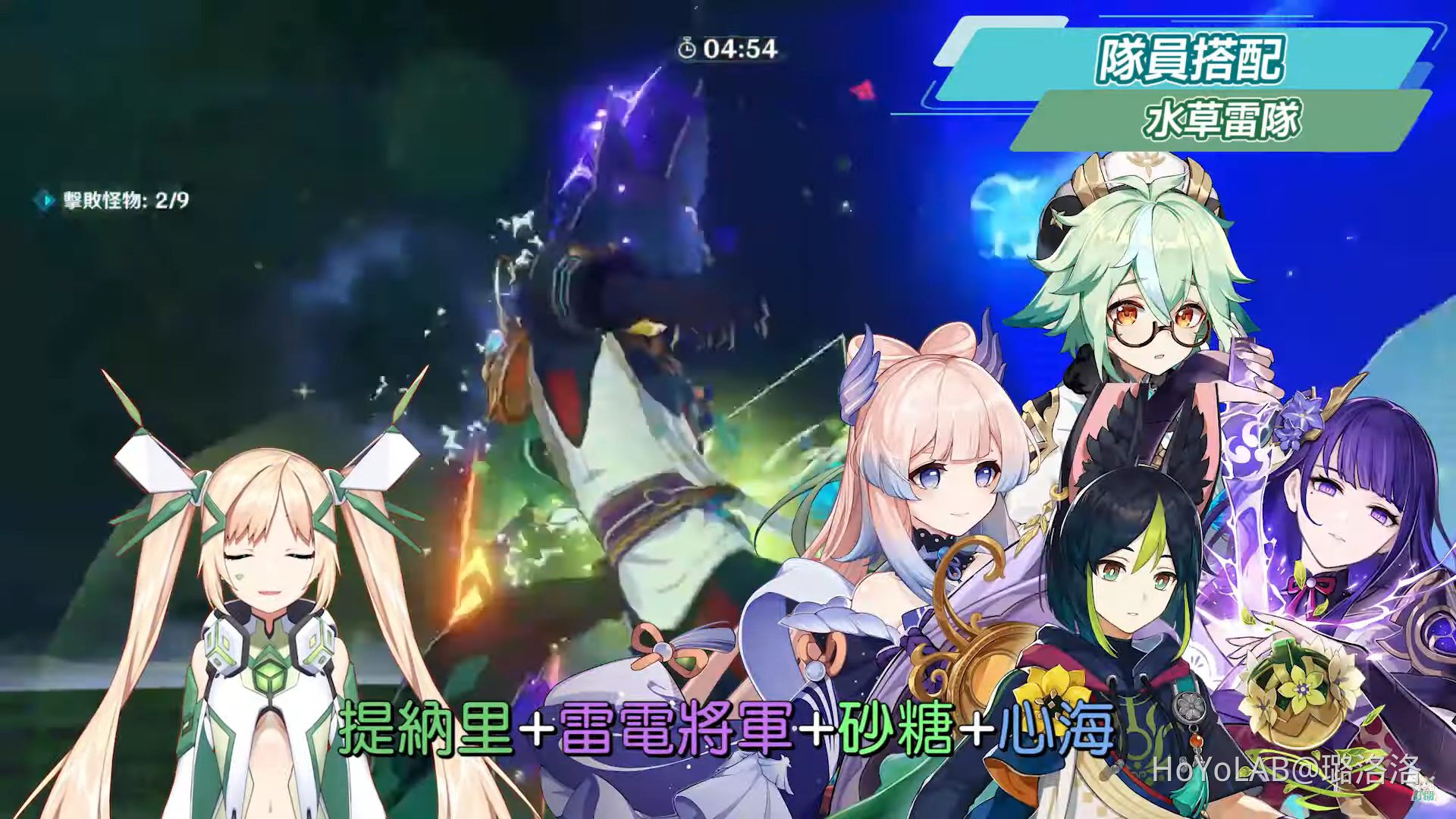 最後就是可以打出激化+綻放反應的水草雷隊,其實在草元素的三種元素相關反應中,洛洛最有感的還是草+雷的激化反應,其次是草+水的綻放反應,最後是比較無感的草+火的相關反應,雖然推薦順序在比較後面,但草+水+雷的激化和綻放反應還算是可以玩的,但是操作上以及元素反應的理解上,屬於需要有一定熟悉程度的玩家才會比較理解,草+水的綻放反應主要是會產生一段時間後會爆炸的草原核,這個草原核在沒有被刺激的情況下爆炸的等待時間有點長,但是若中間搭配有雷元素的刺激,或是高頻的打出超過場上上限的草原核時,草原核就會不斷被引爆,而這種玩法也相對要比較高頻率的去切換自己隊伍中的角色,去觸發水草雷三種元素之間的反應,同時又要注意水、草、雷的元素反應消耗順序,假如敵人身上有水元素附著時,這時就沒有辦法再打出草+雷的超激化或蔓激化,而用草元素攻擊雷水共存的敵人時,雷元素會先消耗,其次才是水元素,所以雷元素消耗完之前會觸發超激化、當雷元素消耗完才會觸發綻放,這邊就有點偏理論的內容了,所以洛洛還是放到後續的影片再說明,總之這邊先示範的陣容為提納里+雷電將軍+砂糖+心海,不過洛洛是覺得水草雷的隊伍或許在後面將推出的須彌角色出來後還有更多玩法,像是妮露、賽諾、艾爾海森等等,因此這個陣容主要先提供給想玩水草雷反應隊伍的玩家嘗嘗鮮。
