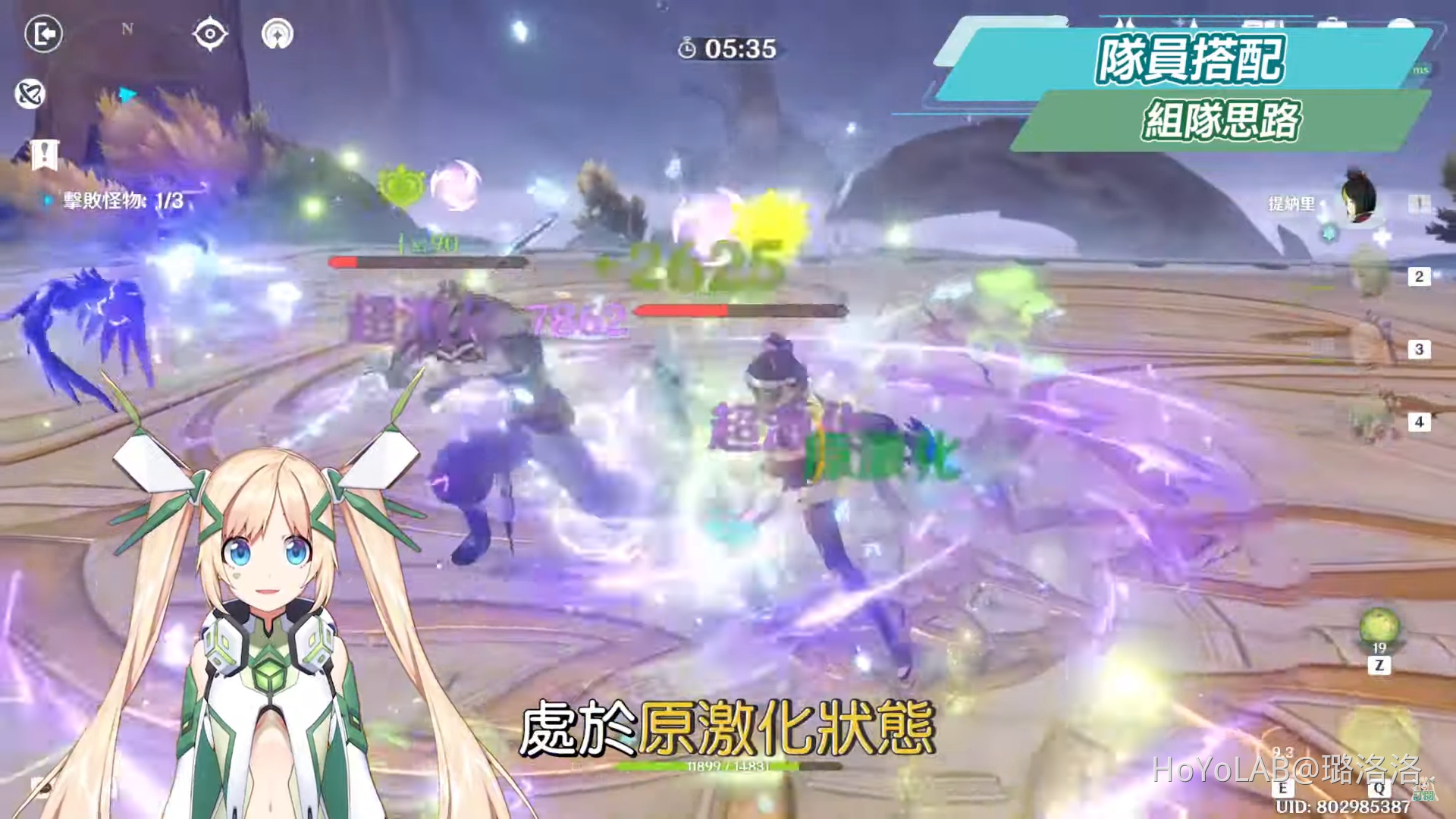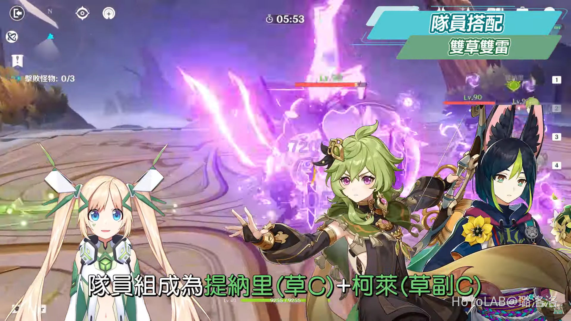 提納里的組隊思路主要從「激化」反應來延伸,也就是說隊伍中一定要至少有一名雷元素角色,剩下可以從組雙草共鳴、雙雷共鳴又或是組上可以提升元素精通、提供護盾、減抗回血的輔助角色等等。輸出上主要透過草+雷打出激化反應,將會有10秒的時間讓怪物處於原激化狀態,而如果是雷草共存狀態下的原激化反應大約可維持5秒,此時再透過後手的雷元素打出超激化反應,又或是後手的草元素打出蔓激化反應,但以目前體驗過草元素相關元素反應的心得來說,洛洛會覺得當前讓草元素作為後台角色、雷元素作為前台角色會更好,理由是雖然草與雷元素同時存在時,雖然不太會互**涉,甚至有一種共存的狀態,但兩者之間的元素量還是會隨著反應觸發的同時逐漸消耗,而又尤其雷元素會比草元素消耗得更快,所以以草元素先作起*、*元素後手打超激化反應的效益更好,後續關於草元素相關反應的篇目洛洛也還會再作個別的影片解說。