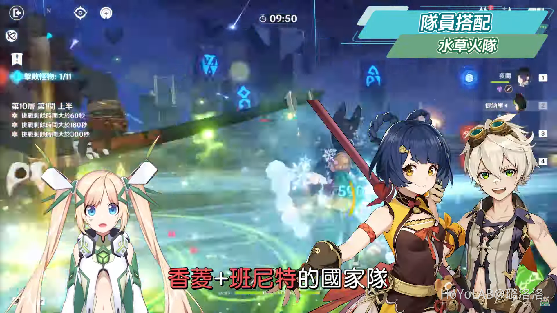 最後就是主要玩水+草+火的烈綻放反應,組成為提納里+行秋/夜蘭+香菱+班尼特的國家隊,打法上主要先透過水+草元素製造出多個草原核,再透過火元素引爆草原核形成爆炸,也因為草原核被引爆的條件是接觸到火元素,所以搭配香菱的鍋巴或是旋火輪可以範圍橫掃到草原核引爆傷害,但若是換作單體輸出為主的宵宮,似乎就不太適合用烈綻放的玩法,而這一隊都是速切型角色,搭配本身就是透過不斷開大的國家隊輸出特性,可以不斷的打出多種草元素相關反應傷害,提納里的角色也可以換成柯萊,算是平民*家隊的新的一種玩法。