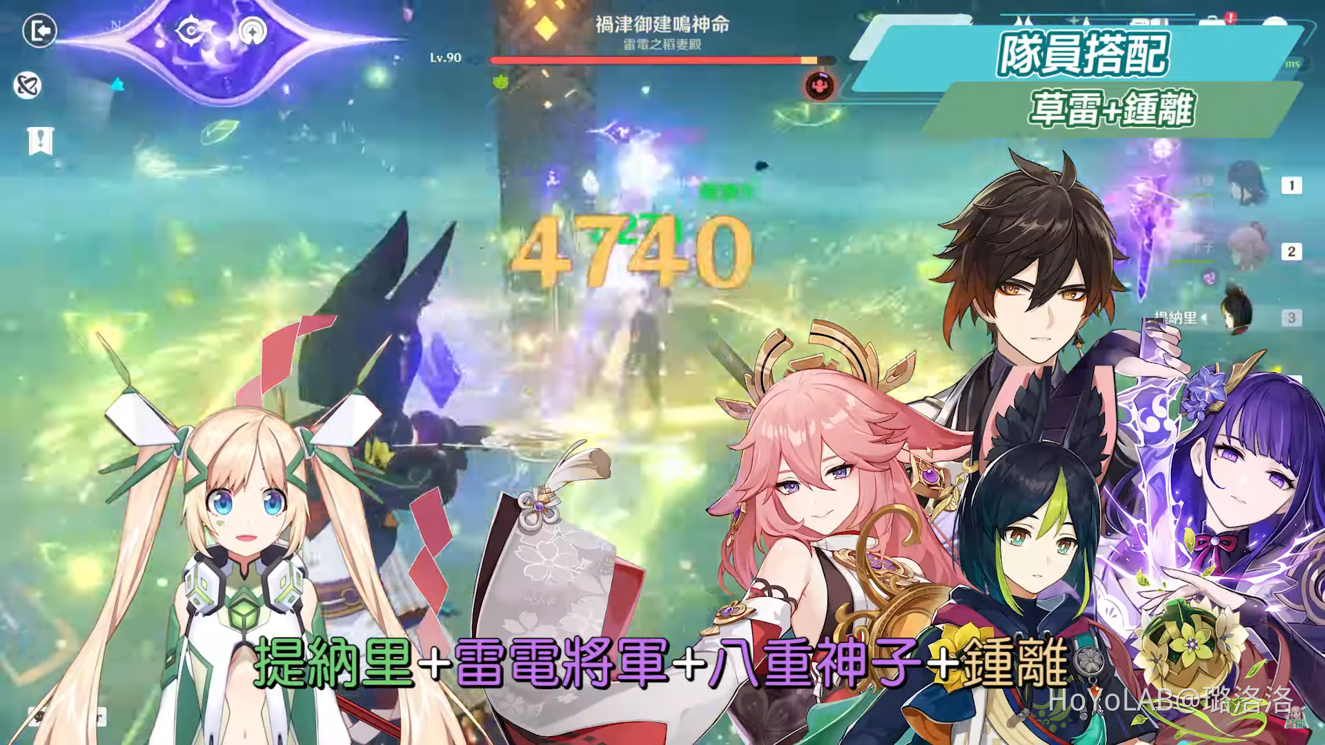 下一個也是草雷激化隊伍,只是加入岩元素,以提納里作為主C的隊伍組成為提納里+雷電將軍+八重神子+鍾離,同時搭配可以湊雙雷共鳴的雷電將軍和八重神子,最後是和提納里一起同為加倍卡池的鍾離,一直被說會退環境的鍾離到須彌版本又更鞏固自身T0輔助的地位,因為他的護盾效果為全元素減抗,所以也就是說鍾離是當前唯一一名可以提供草元素減抗的角色!並且岩元素並不會像水火冰元素去干擾到原激化反應的時間或觸發環境,只是鍾離在開隕石的時候,還是可以注意先用隕石當第一招起手或放在最後一個收尾技能使用比較保險,而若是2命以上雷電將軍作為草雷激化隊伍的主C的話,八重神子可以換成滿命九條裟蘿,這樣隊伍不只可以解放雷九萬班的萬葉和班尼特,同時搭配超激化反應又可以打出極高的雷元素傷害,當然如果雷元素主C要換成刻晴也是沒問題的哦。