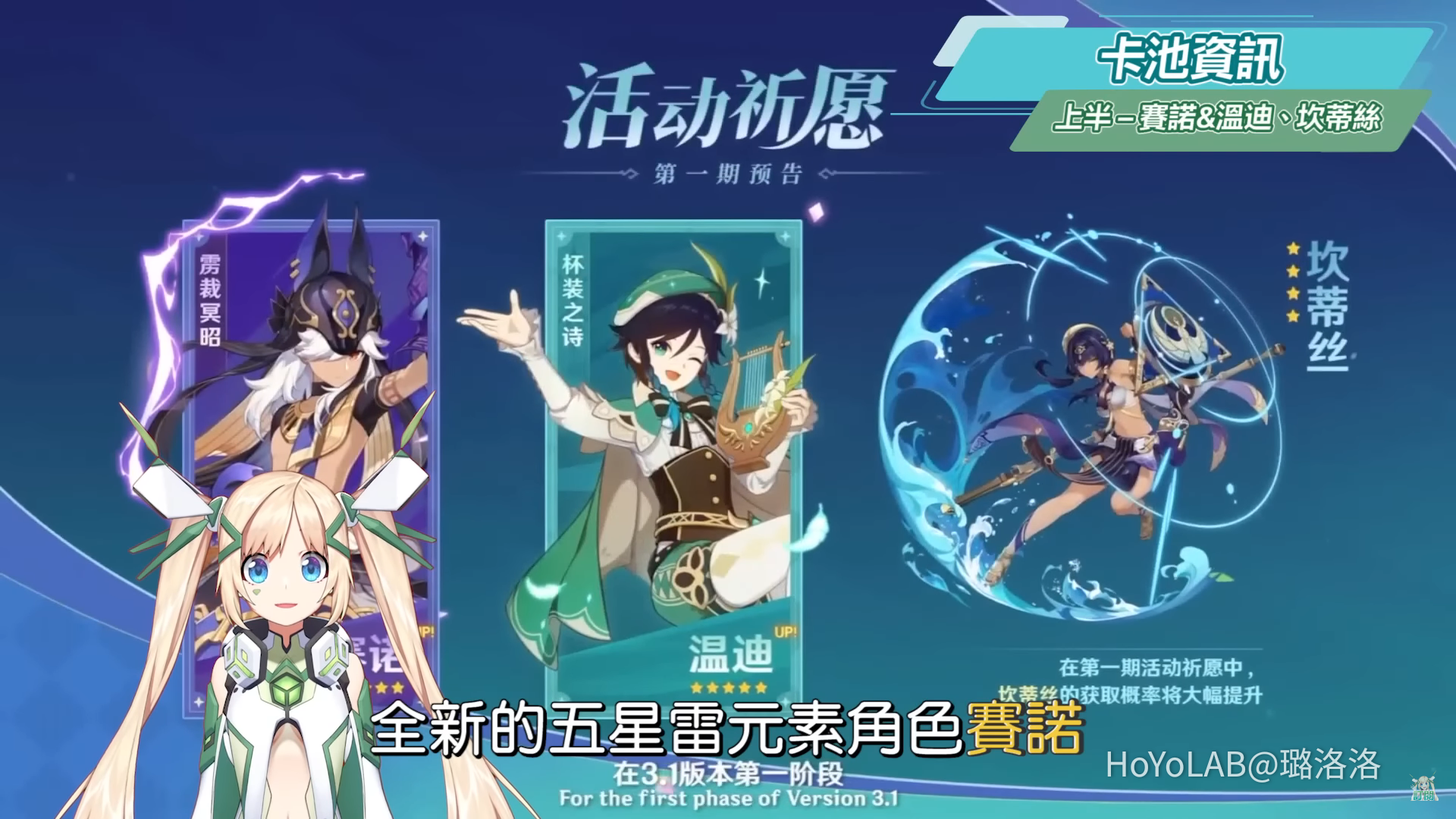 上半卡池登場的角色為全新的五星雷元素角色賽諾,搭配版本活動復刻的溫迪,以及新的四星水元素角色坎蒂絲,3.1上半卡池將會在9/28原神兩周年當日實裝。