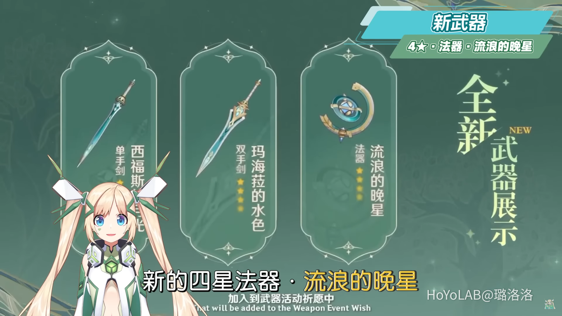 新的四星法器.流浪的晚星,副屬性為元素精通,被動效果為每10秒基於裝備者的元素精通%數轉化為攻擊力,並再基於提升的30%攻擊力為隊伍中附近角色提升攻擊力,持續12秒,若是有其他同名武器還可以疊加效果,後台也能持續作用,初步看會比較適合打激化或劇變反應的非滿命八重與麗莎等角色。