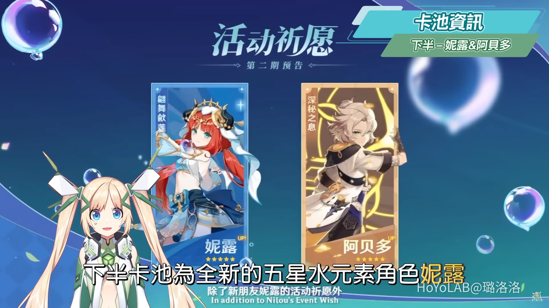 下半卡池為全新的五星水元素角色妮露、搭配復刻的阿貝多,下半卡池約會*10/14*進行更新實裝。