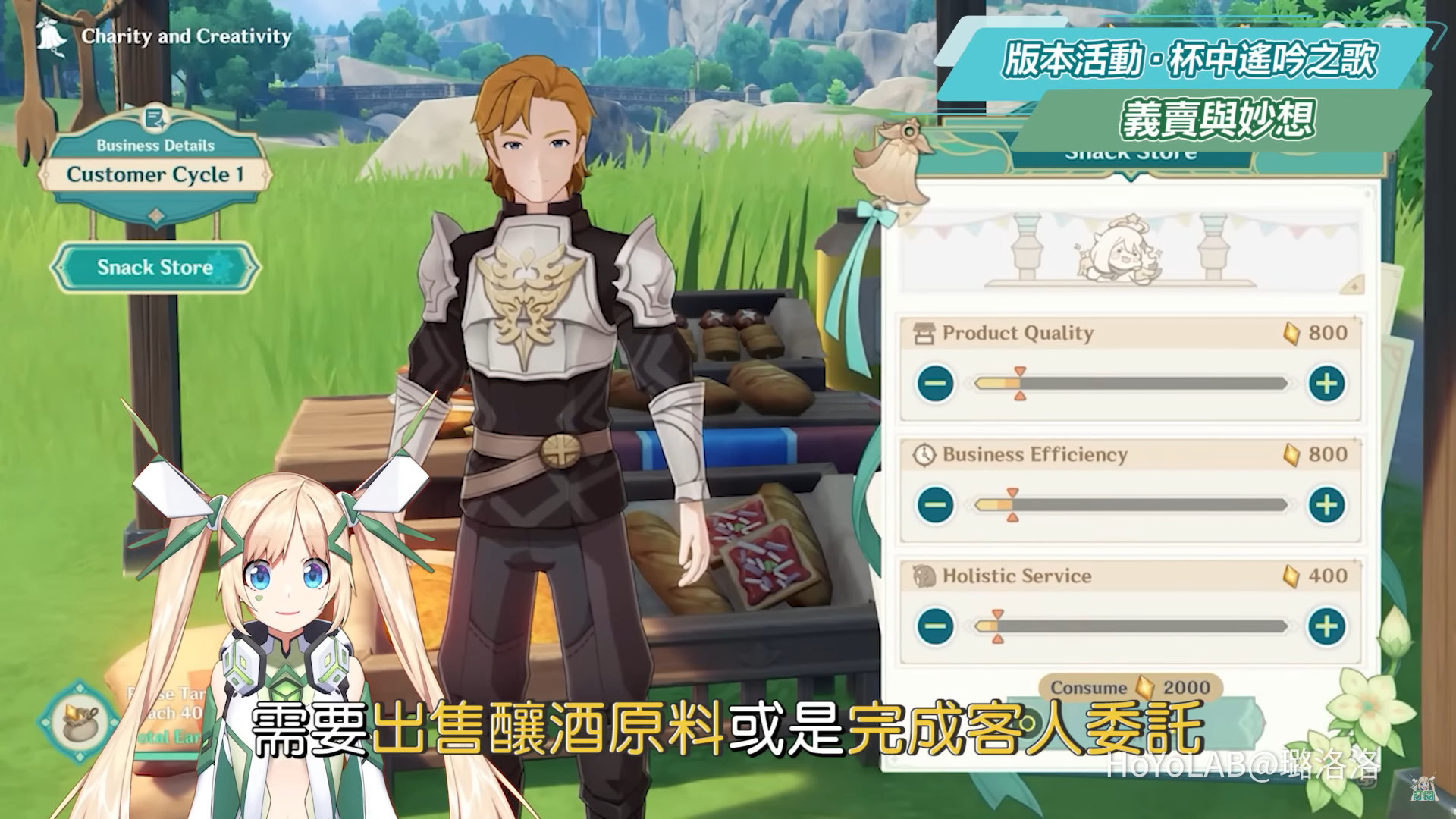 義賣與妙想則是以幫派蒙經營店鋪的玩法,需要出售釀酒原料或是完成客人委託來籌備資金,成功開店後要運用資金分配在三個不同的經營方針上,並在經營過程中適時調整店鋪策略或是邀請助手來協助自己,中間也會遇到不同的突發事件,完成事件可以獲得額外資金。