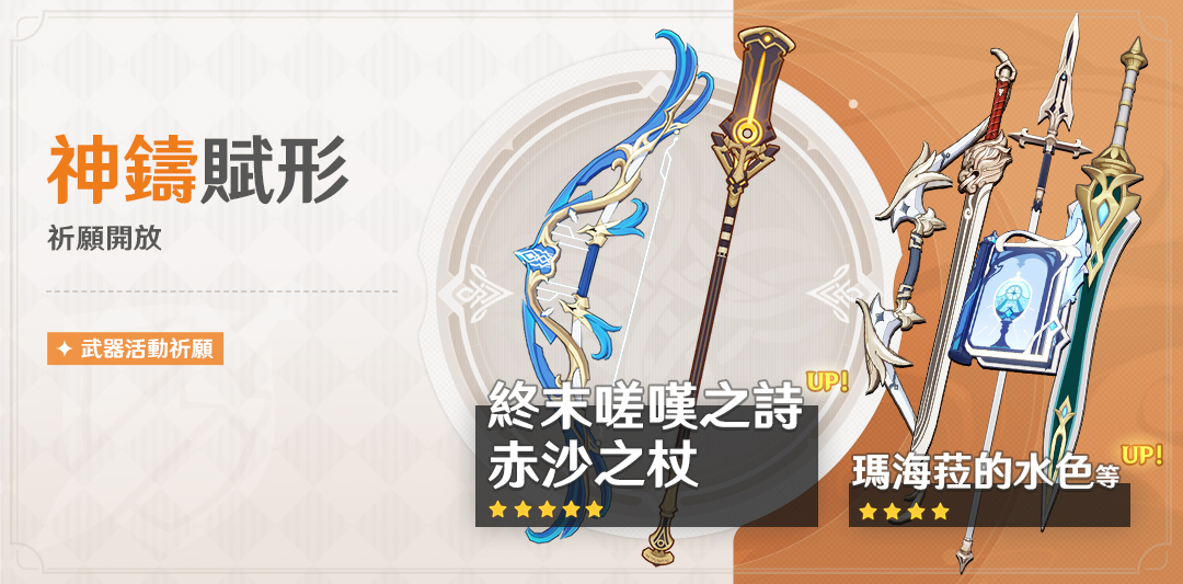 ●活動期間,可使用「神鑄定軌」對本期五星UP武器「長柄武器·赤沙之杖」或「弓·終末嗟嘆之詩」進行定軌,更多「神鑄定軌」詳細規則可點擊祈願介面左下角的【詳情】按鈕查詢。
