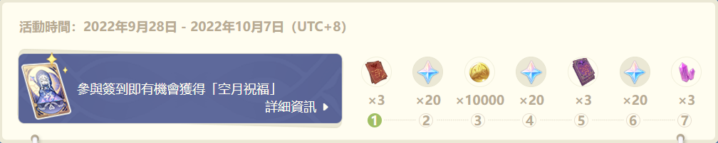 前往前往HoYoLAB社群-工具-原神-簽到,參與七日累計簽到簽活動,即可解鎖更多原石獎勵,還有機會獲得「空月祝福」!