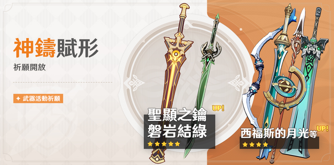●活動期間,可使用「神鑄定軌」對本期五星UP武器「單手劍·聖顯之鑰」或「單手劍·磐岩結綠」進行定軌,更多「神鑄定軌」詳細規則可點擊祈願介面左下角的【詳情】按鈕查詢。