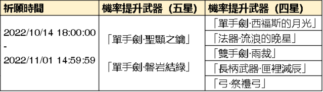 ●活動期間,限定四星武器「單手劍·西福斯的月光」、「法器·流浪的晚星」、四星武器「雙手劍·雨裁」、「長柄武器·匣裡滅辰」、「弓·祭禮弓」的祈願抽取機率將大幅提升!