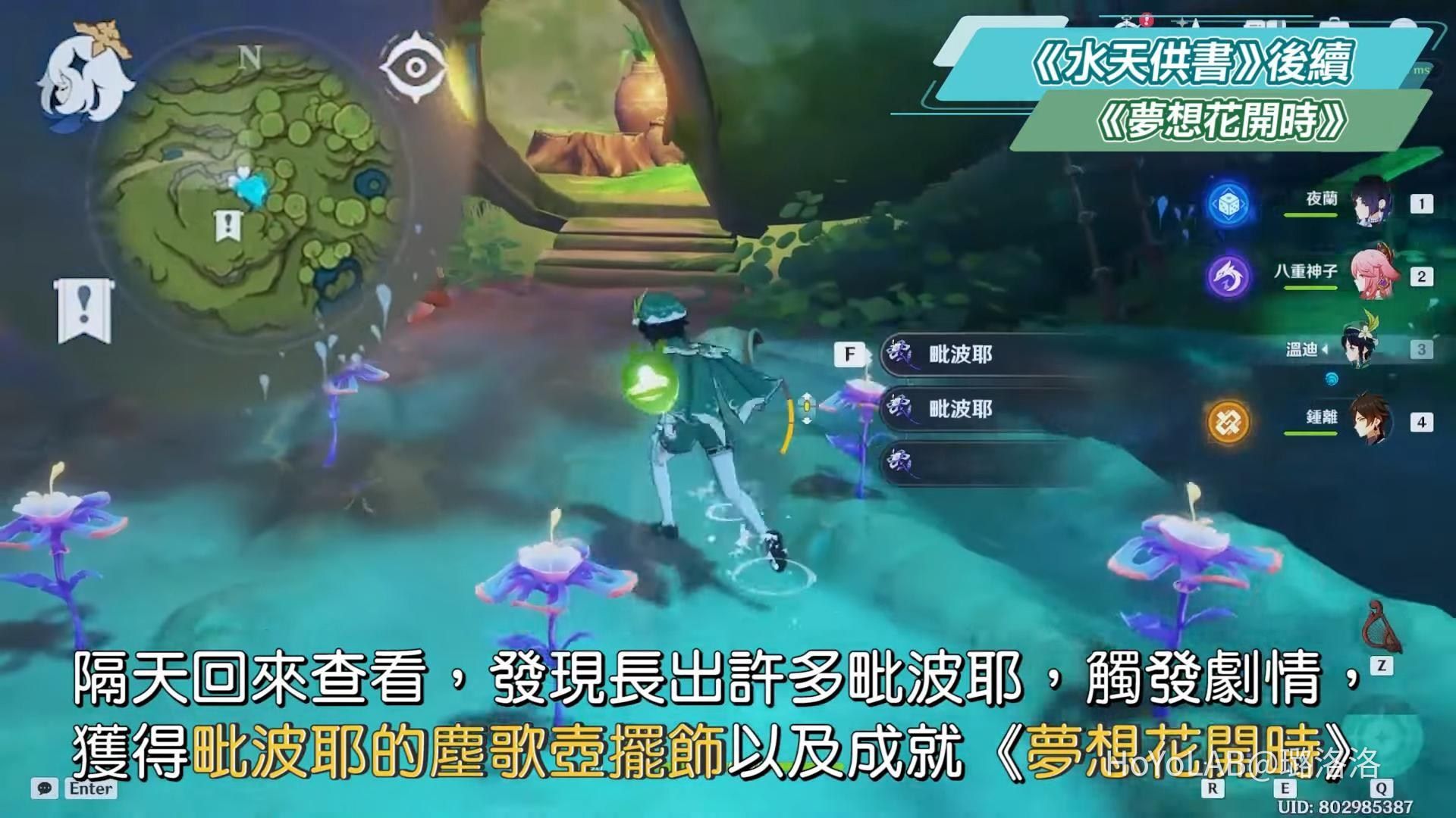 拿完12個種子回到蘭那庫拉的苗圃,將種子全部種下,等待現實時間一天再回來查看,隔天回來查看,發現長出許多毗波耶,觸發劇情,獲得毗波耶的塵歌壺擺飾以及成就《夢想花開時》,至此後續還沒完成。