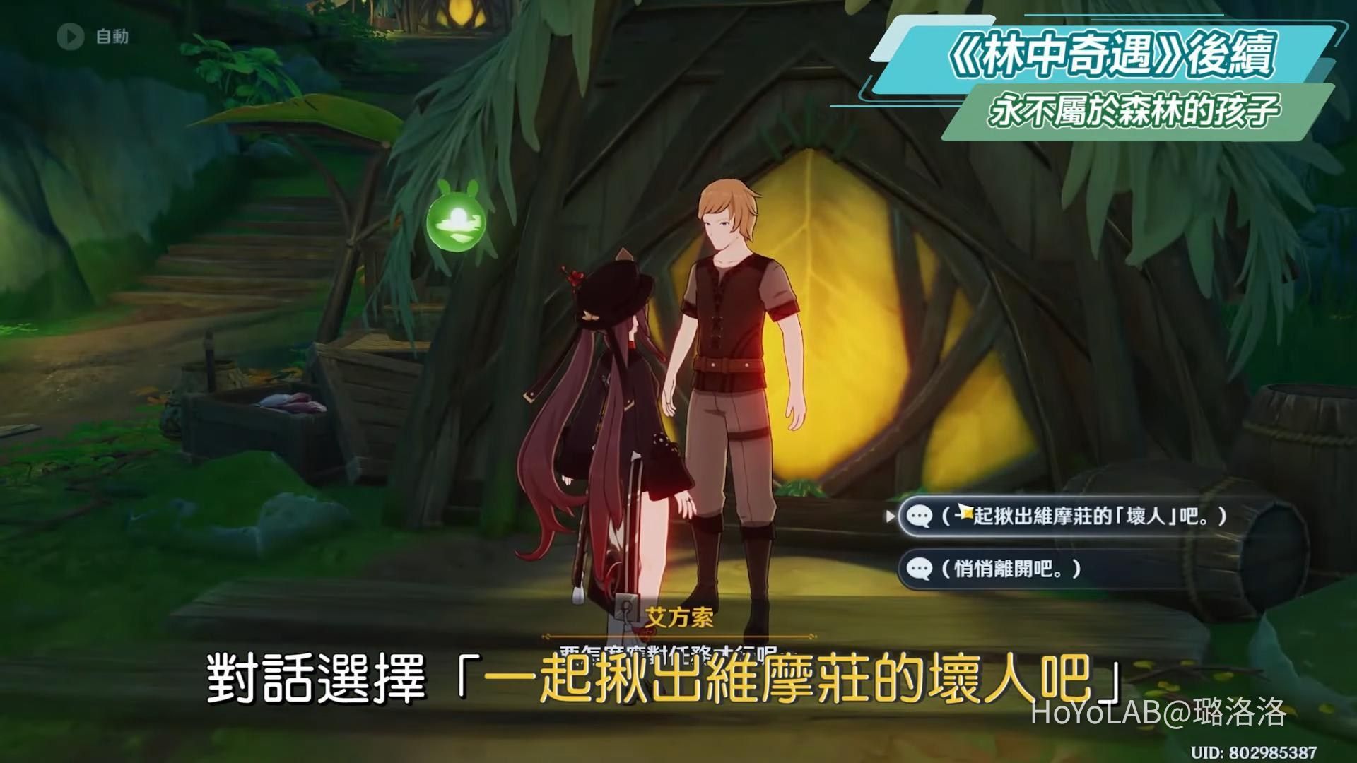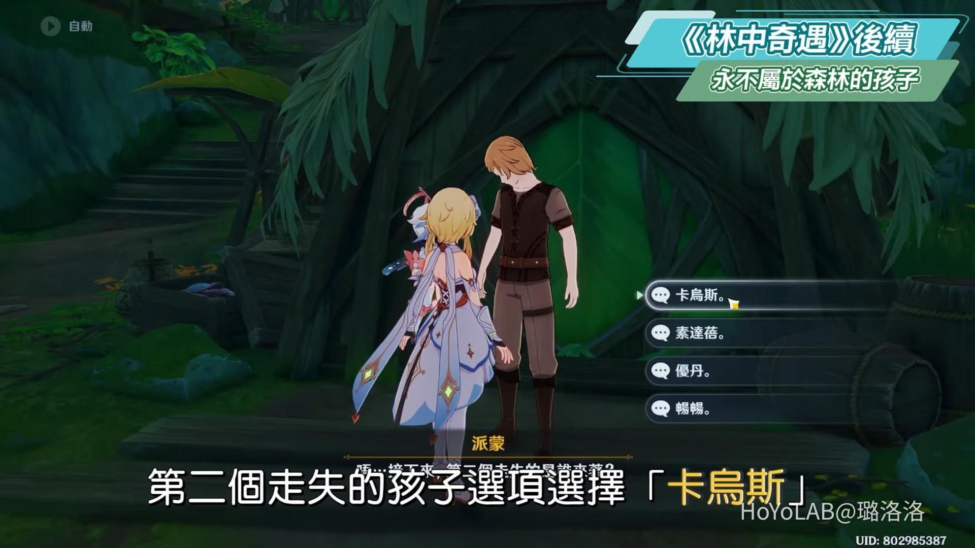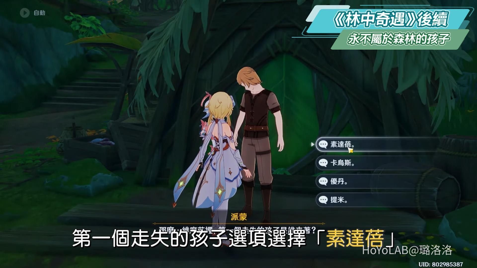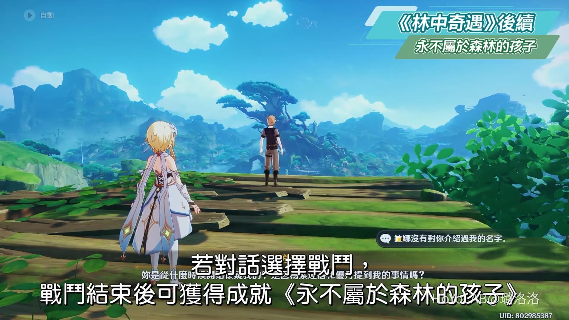 接著支開派蒙後,和艾方索到其他地方對話,若對話選擇戰鬥,戰鬥結束後可獲得成就《永不屬於森林的孩子》。