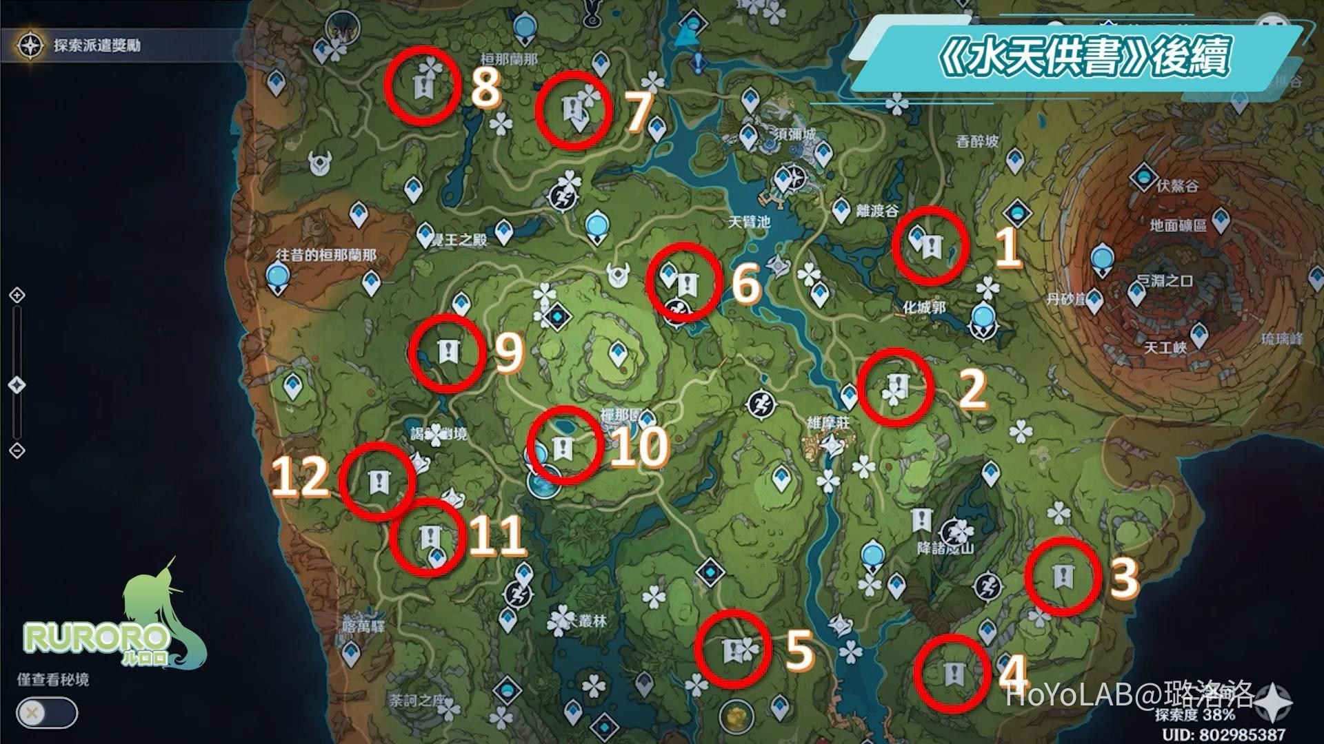 水天供書的後續需要找到12座失落的苗圃把所有的草格子踩過一遍,拿取果實和寶箱,可以先參考地圖標示的12處苗圃位置再跟著影片路線跑。