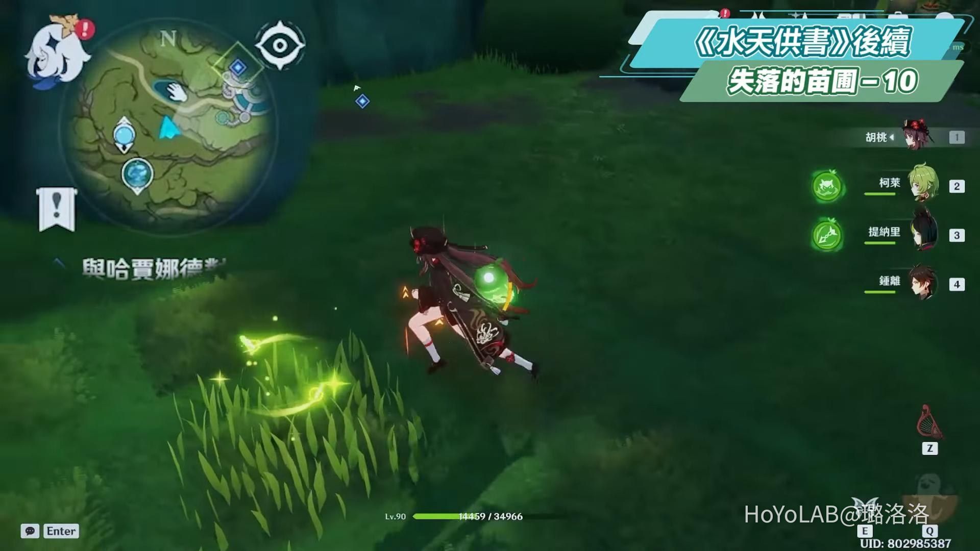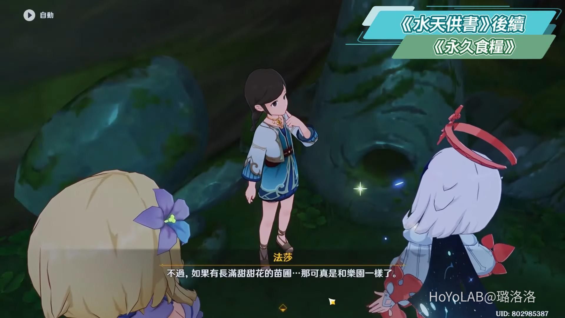 在旁邊可以找到一朵幽閉花,對其彈琴會出現一條路,並發現一名少女,這邊枯木往上有一隻迷茫的蘭那羅和奇饋寶箱,可以順便拿,和亞莎回到苗圃,觸發劇情。對話完獲得成就《永久食糧》,《水天供書》後續完結。