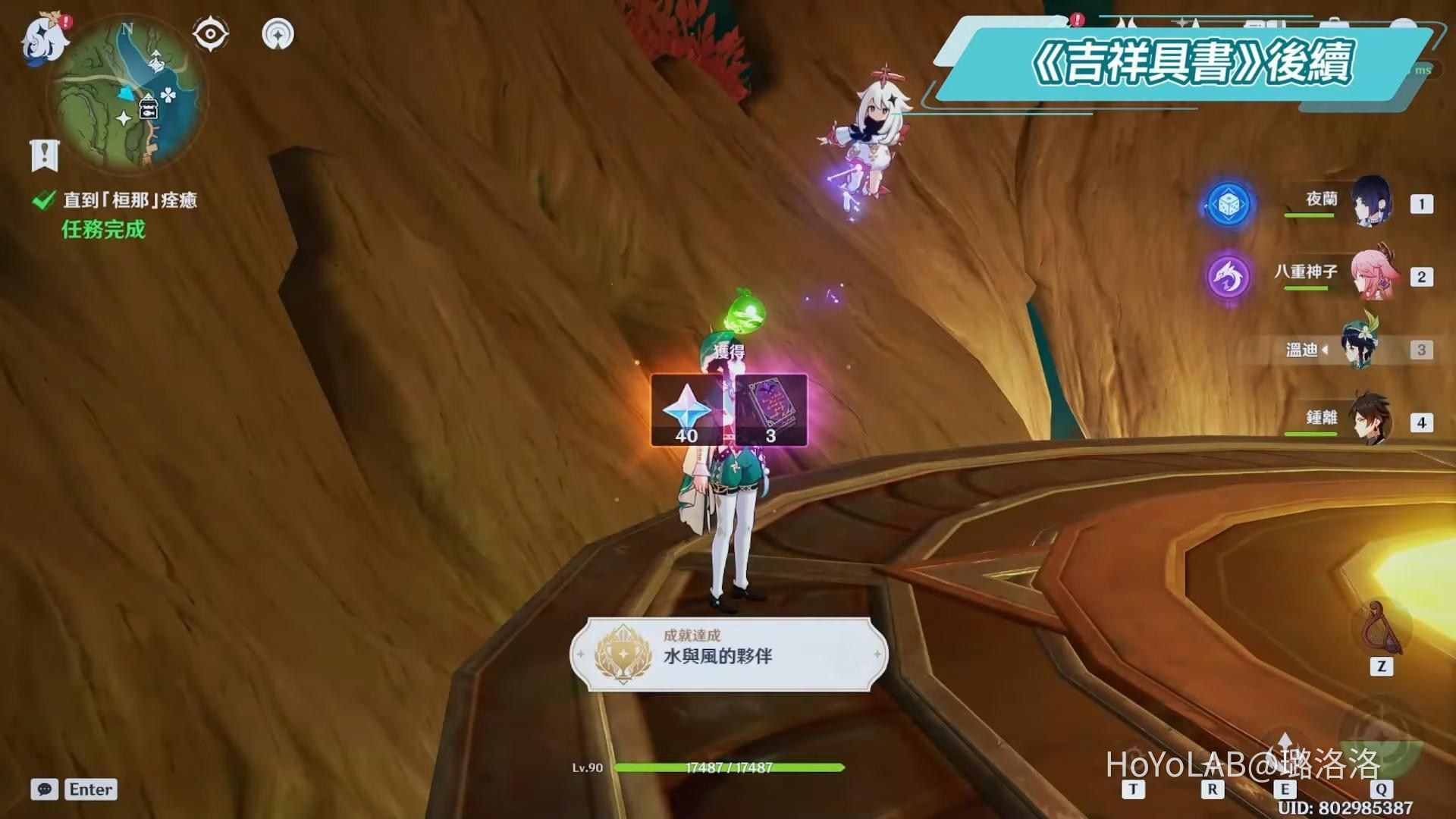 我們要找的解決辦法藏在最中間的桓摩達,跟隨指引來到降諸魔山的遺跡巨像裡找到加札里後來到迪弗舊窟,劇情對話結束後需要擊敗三波三屬的深淵法師,建議攜帶風系角色一起破盾。與加札里和蘭利遮對話後,《吉祥具書》後續與整本森林書也都全數完結,獲得成就《水與風的夥伴》。