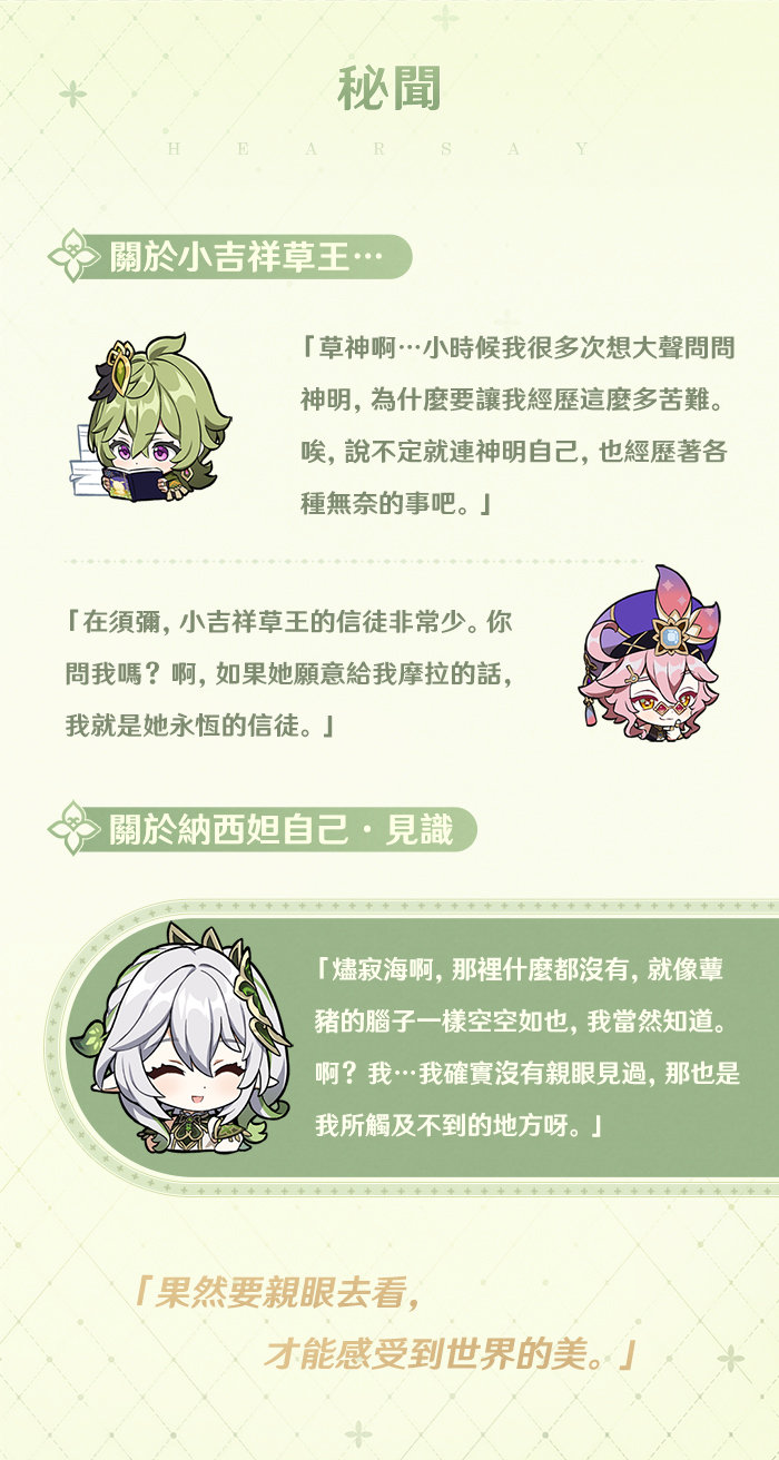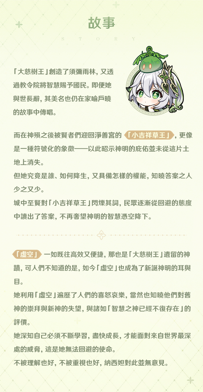 納西妲深知自己必須不斷學習,盡快成長,才能面對來自世界最深處的威脅,這是她無法回避的使命。