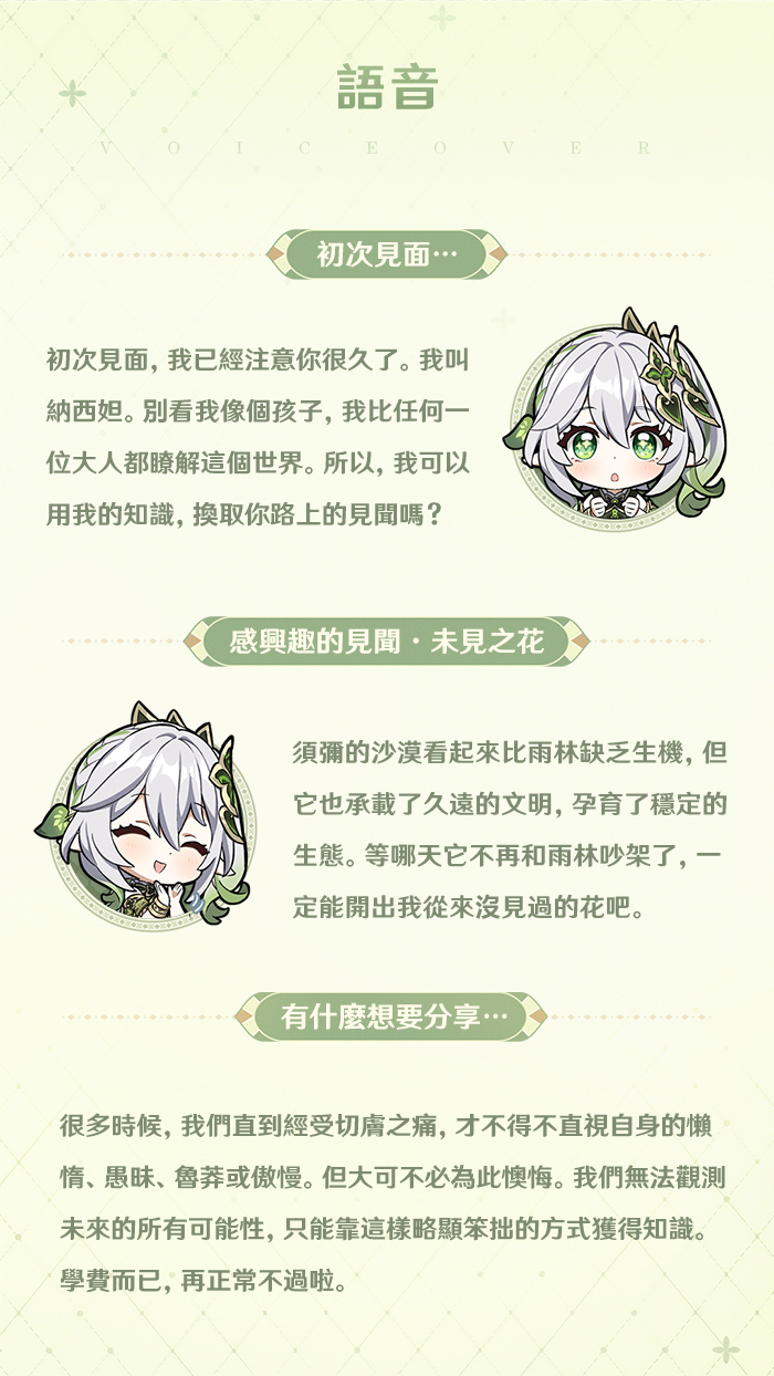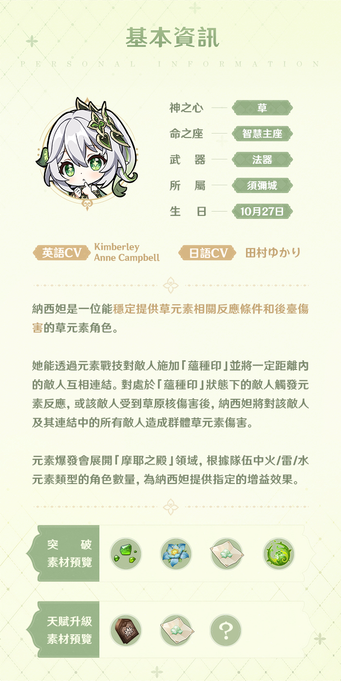 旅行者們好呀!今天為大家介紹的角色是「小吉祥草王」——納西妲。