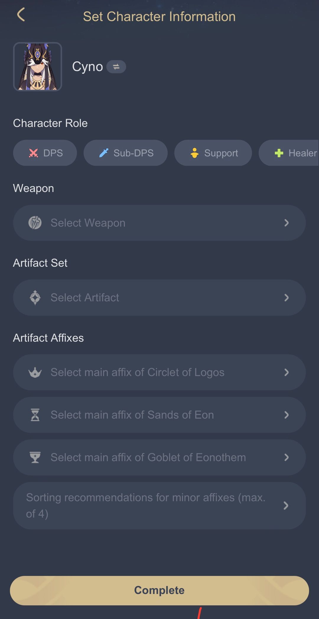 在加入角色時,需選擇對應角色的定位、武器、聖遺物套裝和聖遺物屬性