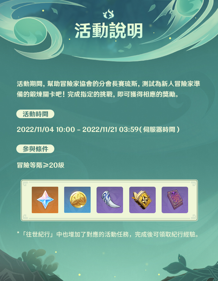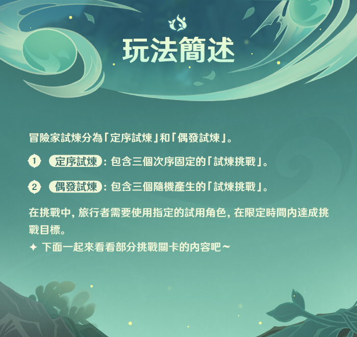 為了鍛煉新人冒險家的體力和意志,蒙德的冒險家協會分會長賽琉斯準備了許多鍛煉關卡,只不過,這些關卡究竟難度如何,新人冒險家究竟能不能順利通過,心裡沒底的賽琉斯便委託你協助一連串測試…