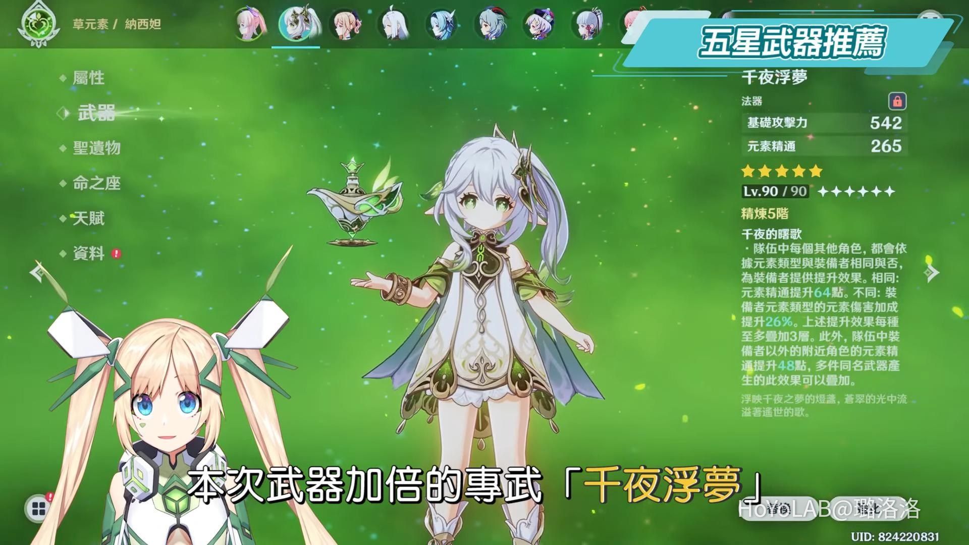 五星武器的部分先以納西妲自身的元素精通是否有來到850~900左右的門檻,缺元素精通優先穿戴元素精通加成的武器,其次才是考慮雙暴相關的武器,五星武器中首選為本次武器加倍的專武「千夜浮夢」,當站場玩法時可以考慮的其他雙暴類五星武器有:神樂之真意、四風原典等。