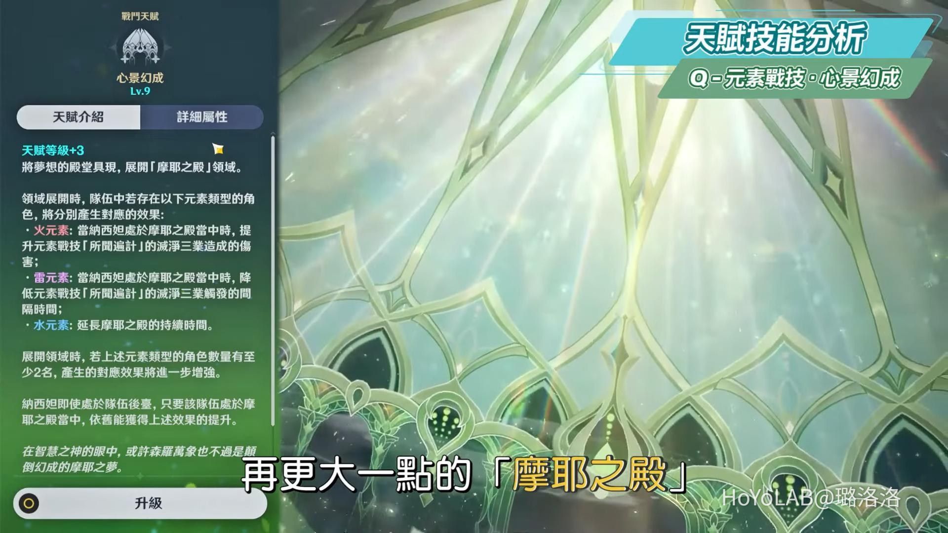 納西妲的元素爆發施放後會讓你直呼:「哇~你家真大」會產生一個比八重神子2命攻擊範圍再更大一點的「摩耶之殿」,但比起E技能的輸出效果來說,Q大招比較偏向是提供輔助作用,並且Q大招施放後是不會對敵人造成任何傷害與掛草效果的,在大招領域內,會根據隊伍中所擁有的火、雷、水元素角色的數量產生不同的效果,在多人聯機時也適用,0命狀態下,隊伍中有1名對應元素角色就可以獲得一層BUFF效果,而有2名火元素角色則會使滅淨三業傷害更加提升、有2名雷元素角色則會使滅淨三業觸發時間降低更多、有2名水元素角色則會使摩耶之殿持續時間更長,而若是解鎖1命之後,要疊加到最大層數就只需要有1名符合元素的角色即可。