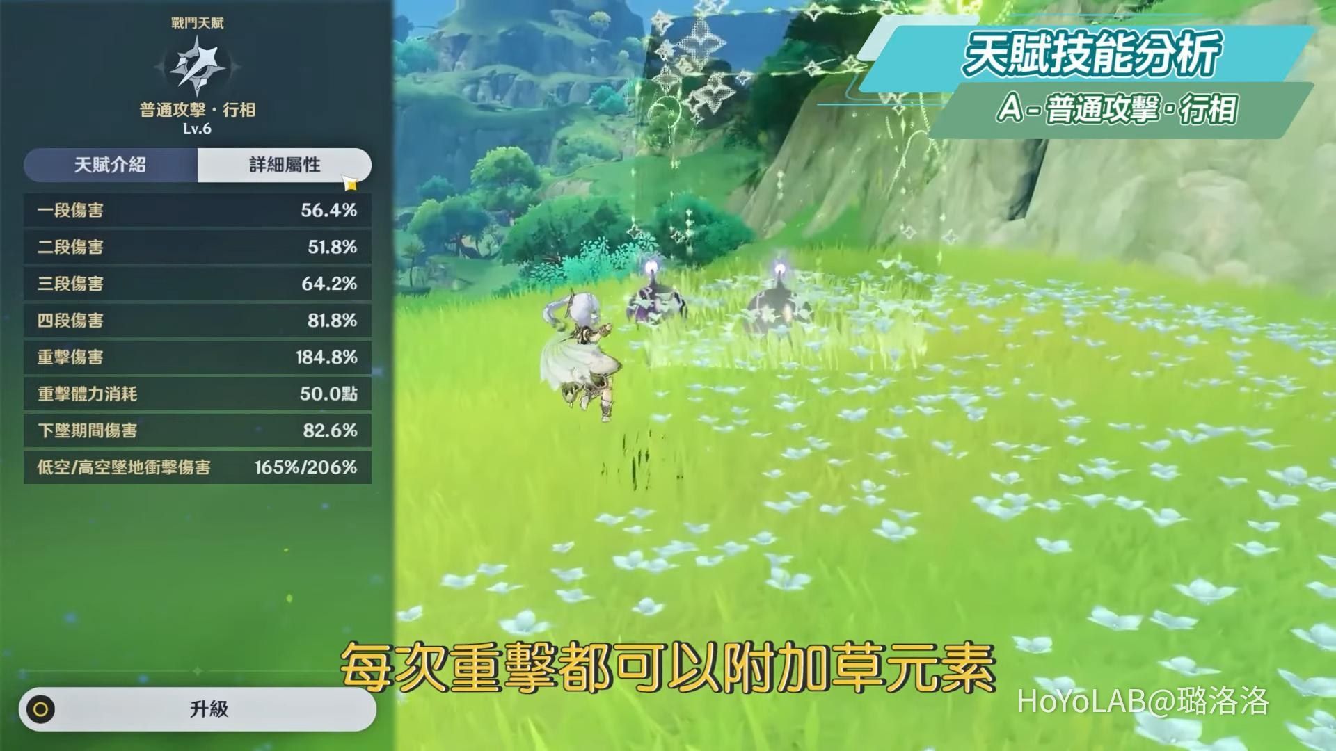 納西妲的普攻是四段式的草元素傷害,攻擊方式是類似踩鍵帽的地面攻擊波,攻擊距離較短,重擊則是一個正方體的草元素範圍傷害,站場輸出的時候要與敵人的位置稍微離得*一點才會比較容易命中,而普攻、重擊、下落攻擊的草元素附著皆為弱草元素,同時普攻會遵守元素附著間隔的機制,也就是2.5秒內每間隔2次攻擊施加草元素附著,但重擊的草元素附著和普攻分開,每次重擊都可以附加草元素。