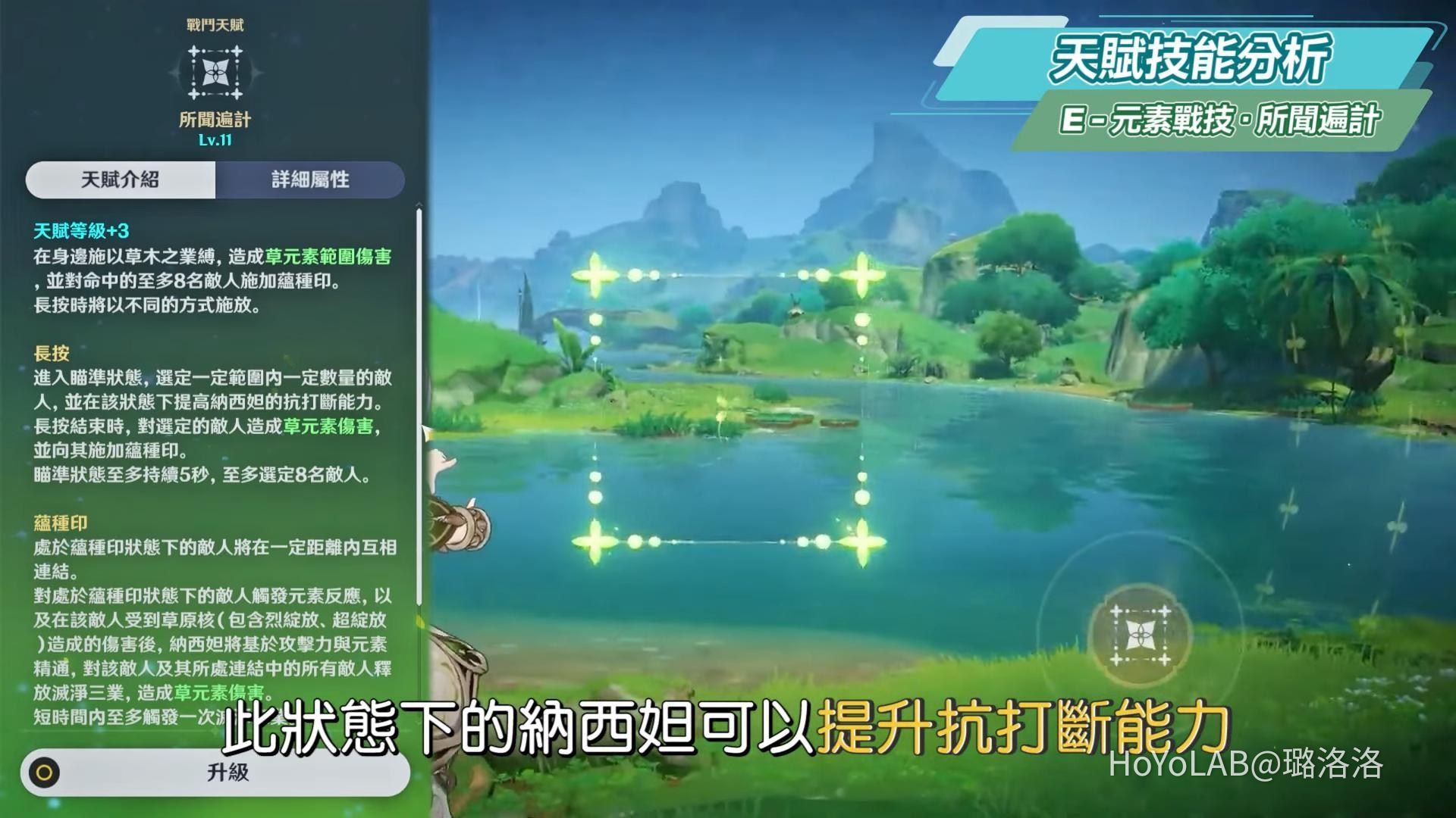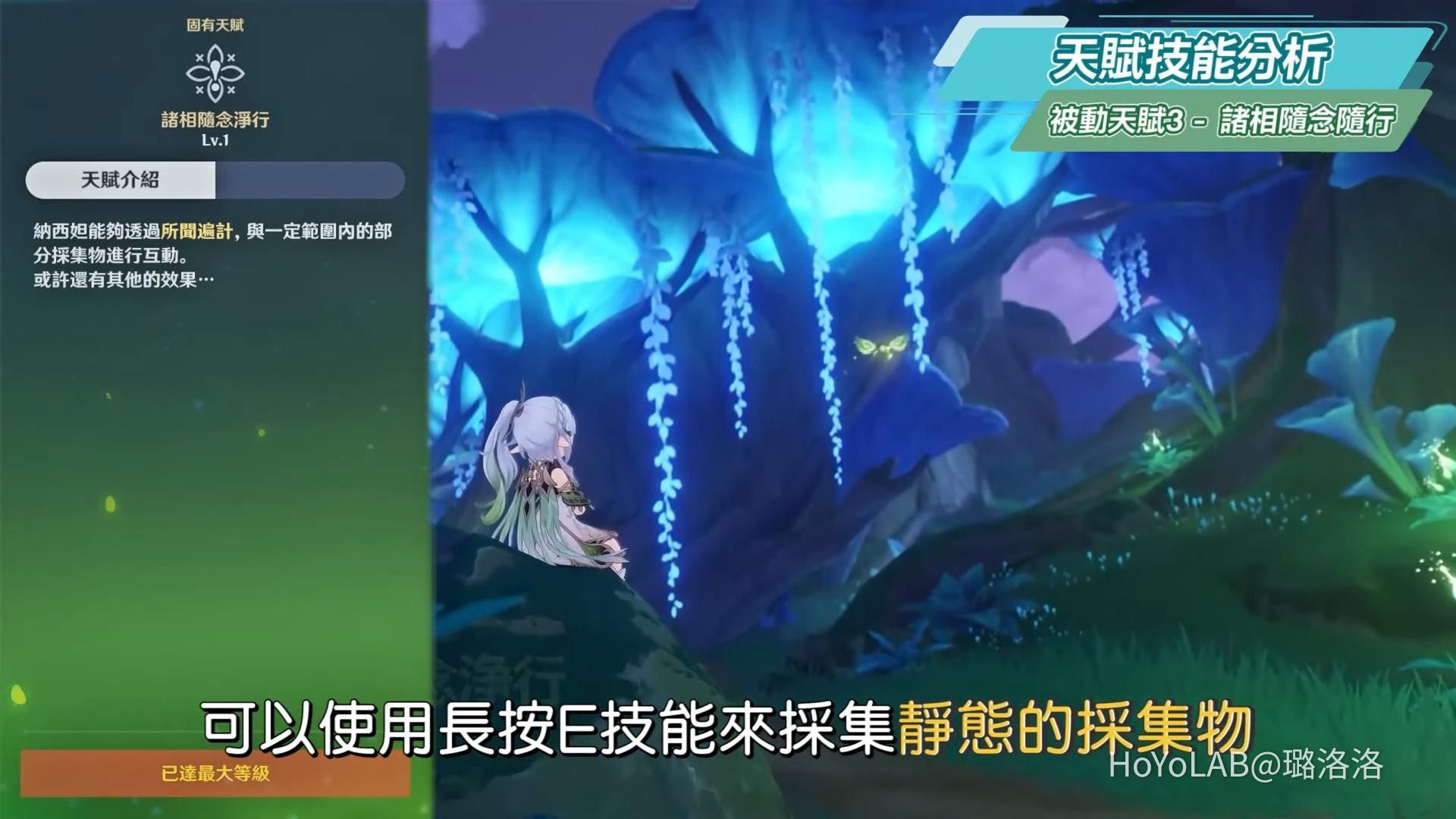 納西妲的被動天賦3可以使用長按E技能來採集靜態的採集物,不會動的動物或植物基本上都可以採,像是植物、鳥蛋、星螺、鬼兜蟲這類都可以,但像是會動的聖金蟲、蝴蝶和礦物類的都不行、其他開寶箱、任務相關或是打怪掉落的物品也不行、要透過特殊方式採集的烈焰花或緋櫻繡球也不行,雖然可以採比較麻煩的劫波蓮和琉璃袋,但可惜的是不能抓晶蝶。另外E技能在對須彌地區中有名字的NPC長按使用時,可以看到他們的內心話和心情,而且還有語音。