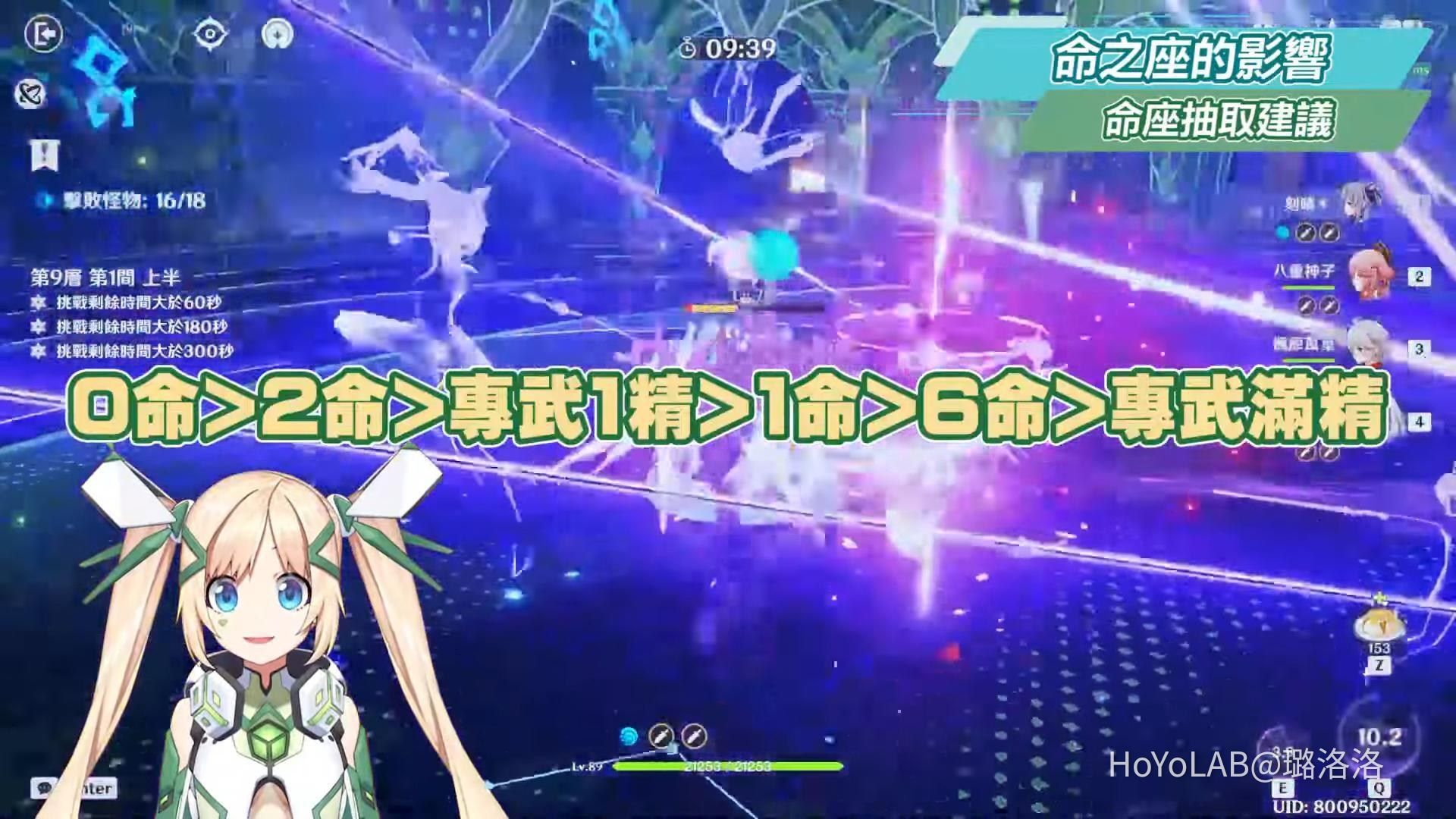 1命解鎖後可以讓Q大招的摩耶之殿降低計算對應元素的角色數量,只要領域內有1名對應元素,就可以直接享有最大層數的BUFF,而就算隊伍中沒有任何對應元素的角色,也可以享有基礎1層的效果,基本上等於水火雷BUFF直接全開的概念。