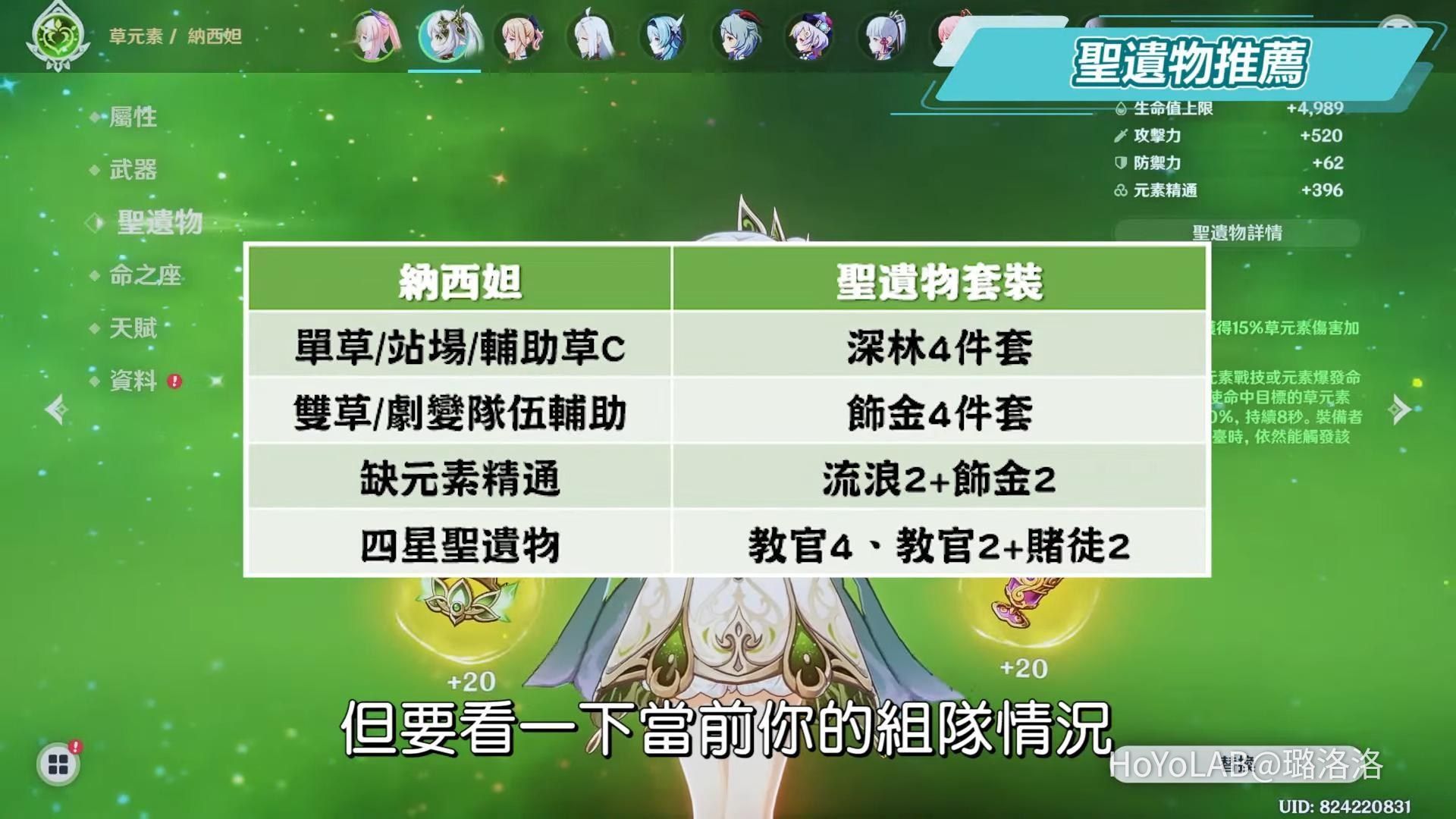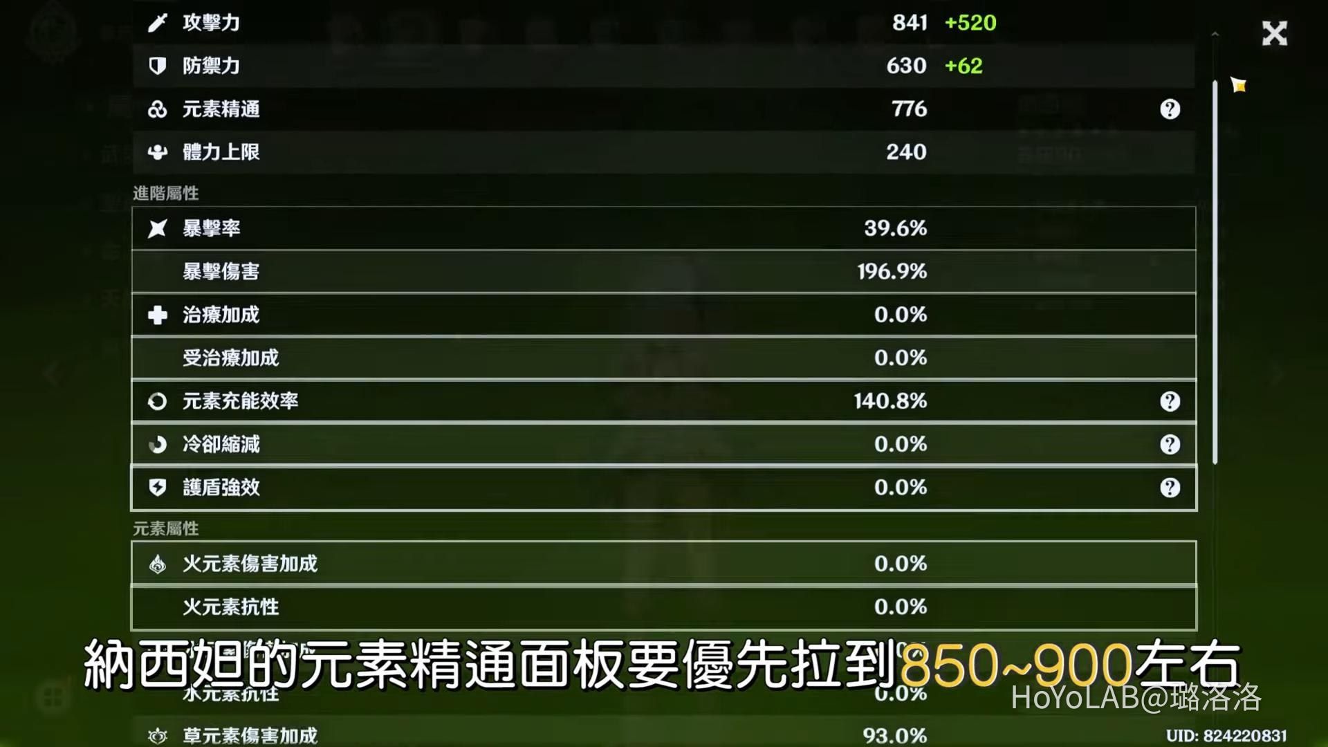 因為被動天賦2機制的關係,納西妲的元素精通面板要優先拉到850~900左右,而也因為隊伍中可能會有帶一些提供元素精通加成的隊友、或是納西妲有持專武、有抽4命、有提升元素精通的聖遺物效果等等,所以自己要算一下是否加上這些後會超過1000,850~900是洛洛大致上擬出的一個基準值,每個人可能不太一樣,因此如果懶得算的話可以參考洛洛的畢業數值。