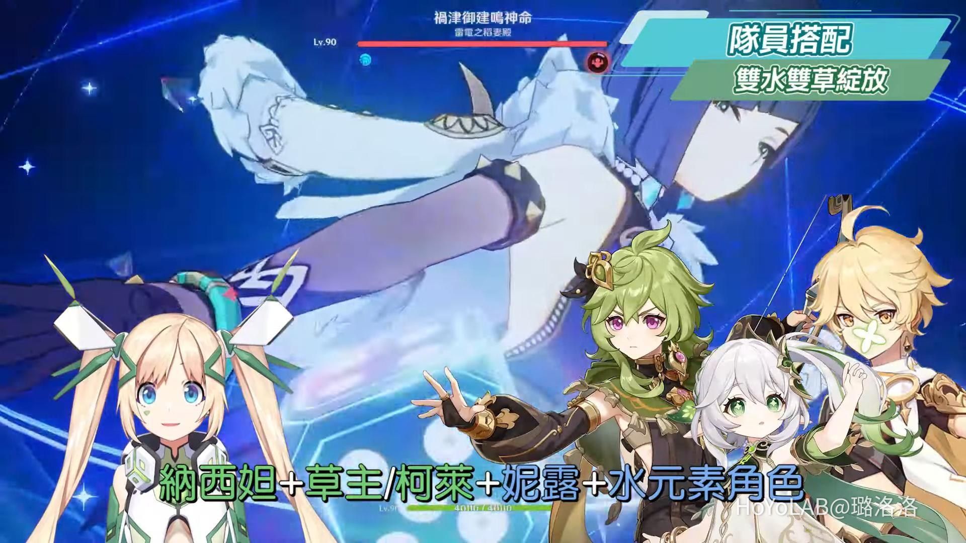 雙水雙草綻放隊為妮露的水草綻放隊,隊伍組成為納西妲+草主/柯萊+妮露+水元素角色,水元素的角色選擇有很多,假如納西妲為站場定位的話,選用元素精通與雙暴相關聖遺物與武器,水元素可以搭配奶*心海或芭芭拉,而假如是納西妲作為奶*定位則帶試作金珀,但要注意奶量若是不足的情況下要小心被自己炸死,此外也可以考慮納***草站場,剩下三名全部為水元素角色的綻放隊玩法。