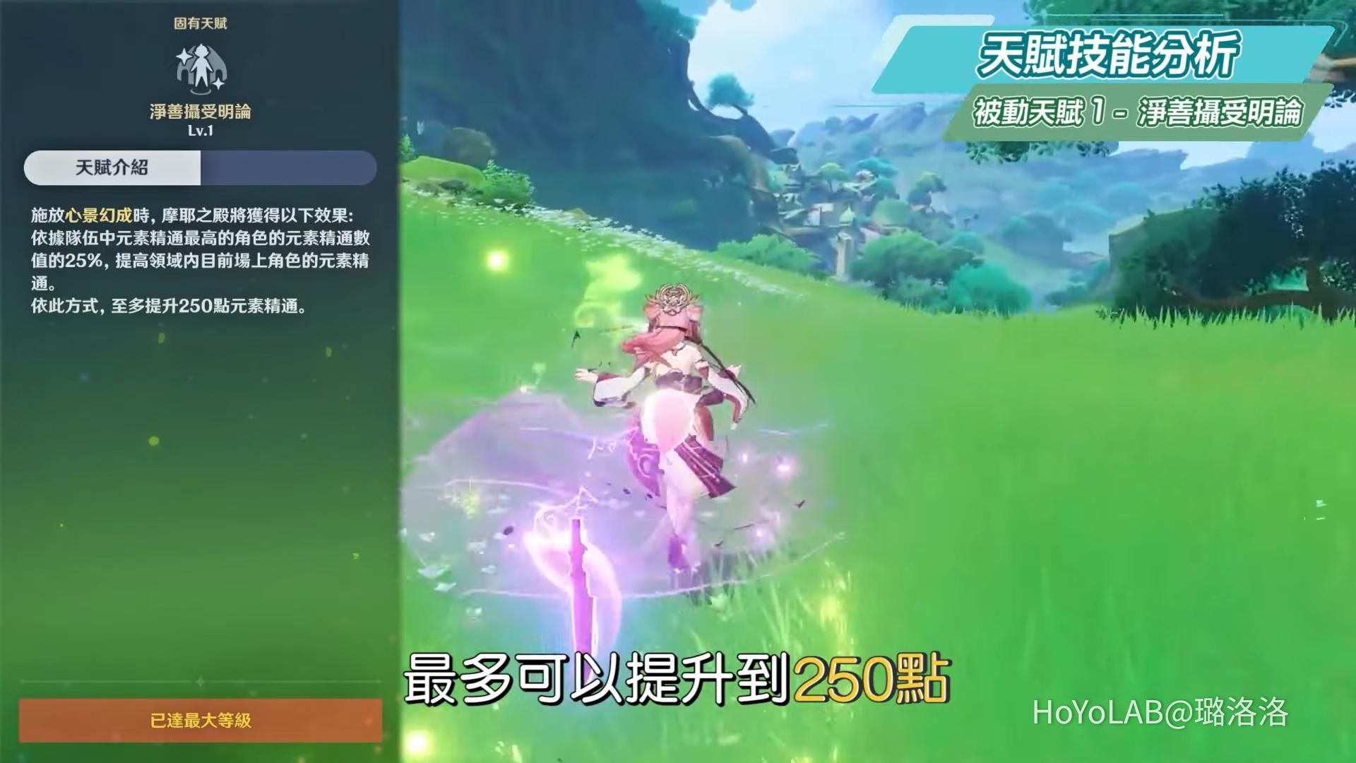 被動天賦1會在納西妲開大後,依據隊伍中最高元素精通的該名角色的元素精通數值的25%,提高領域內當前場上角色的元素精通,最多可以提升到250點,提供的數值是鎖面板的,並且BUFF轉換計算是看當下最高精通角色的「非額外元素精通」的總和,例如砂糖的被動天賦提供的百分比元素精通加成就屬於「額外元素精通」,並不會被納西妲的被動天賦轉化,而若是納西妲的4命效果、阿貝多和鹿野院平藏的被動天賦、飾金套的4件套效果、武器的數值等等,才是提供能被轉化的非額外元素精通,因此如果是穿飾金套的納西妲,就記得先觸發元素反應和套裝效果後再開大。