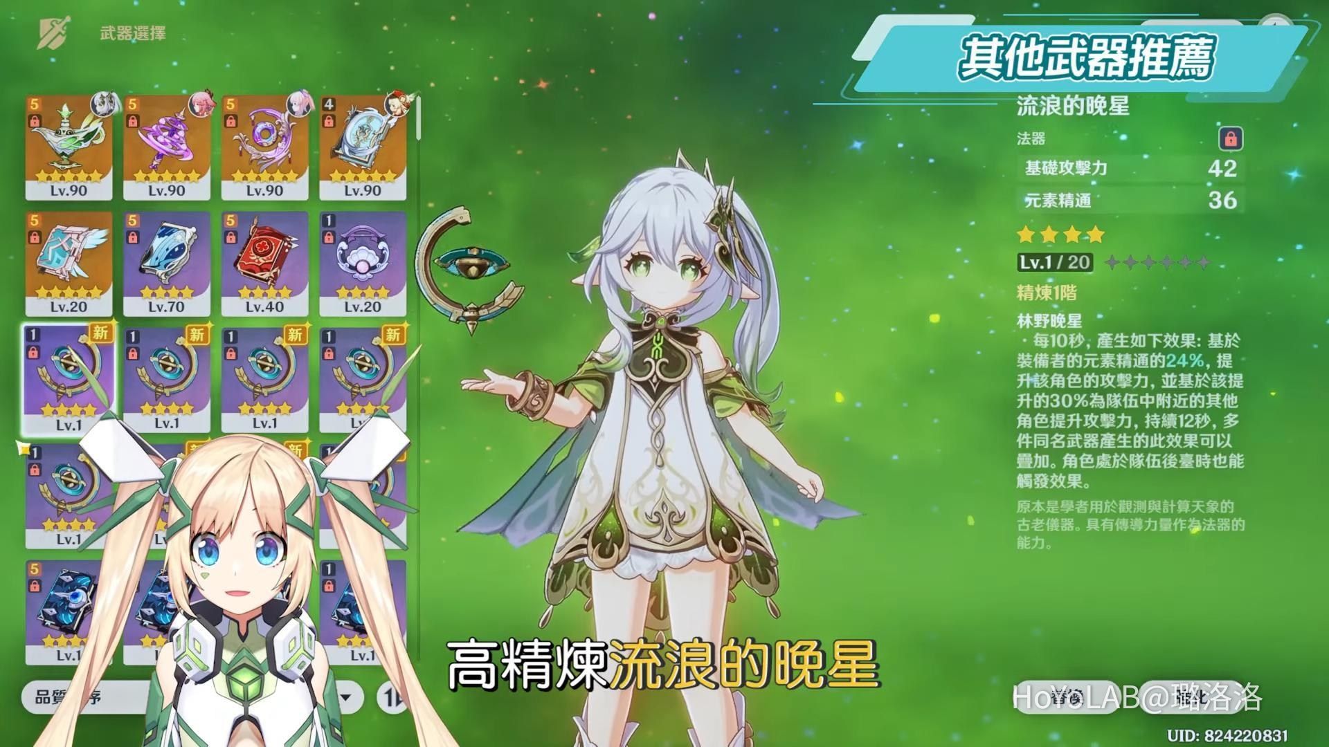 其他武器的部分,從元素精通向考慮的話可以選擇高精煉流浪的晚星,還可以提供隊友攻擊力加成,只是這把武器是限定四星,所以上一池沒有抽妮露武器的人可能就沒有幾把,另外則會比較推薦流浪的樂章,切角登場時一共會有三種BUFF,都是納西妲吃得到的加成,站場或輔助皆可用,再來也可以考慮用三星的魔導緒論,滿精煉情況下效果會再比滿精煉流浪的晚星還要再好一點,主要是因為被動可以使受到水或雷元素影響下的敵人傷害提升,主屬性提供元素精通之餘,被動放在綻放或激化隊也都可以用,取得上也比流浪的晚星容易滿精煉,其他輔助向還可以考慮的有祭禮殘章、萬國諸海圖譜、但祭禮殘章的被動不是很實用,萬國諸海圖譜的效果要站場才有也不算太好用,缺暴率可以考慮的還有匣里日月,沒提到的武器基本上就不是太推薦,還不如直接用三星魔導緒論。而若是讓納西妲作為隊伍中的奶*位置的話,也可以選擇穿戴試作金珀。